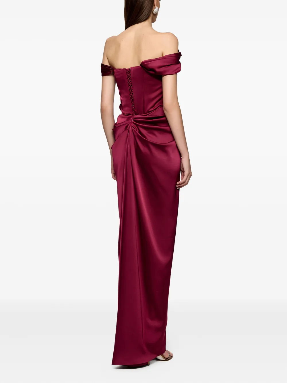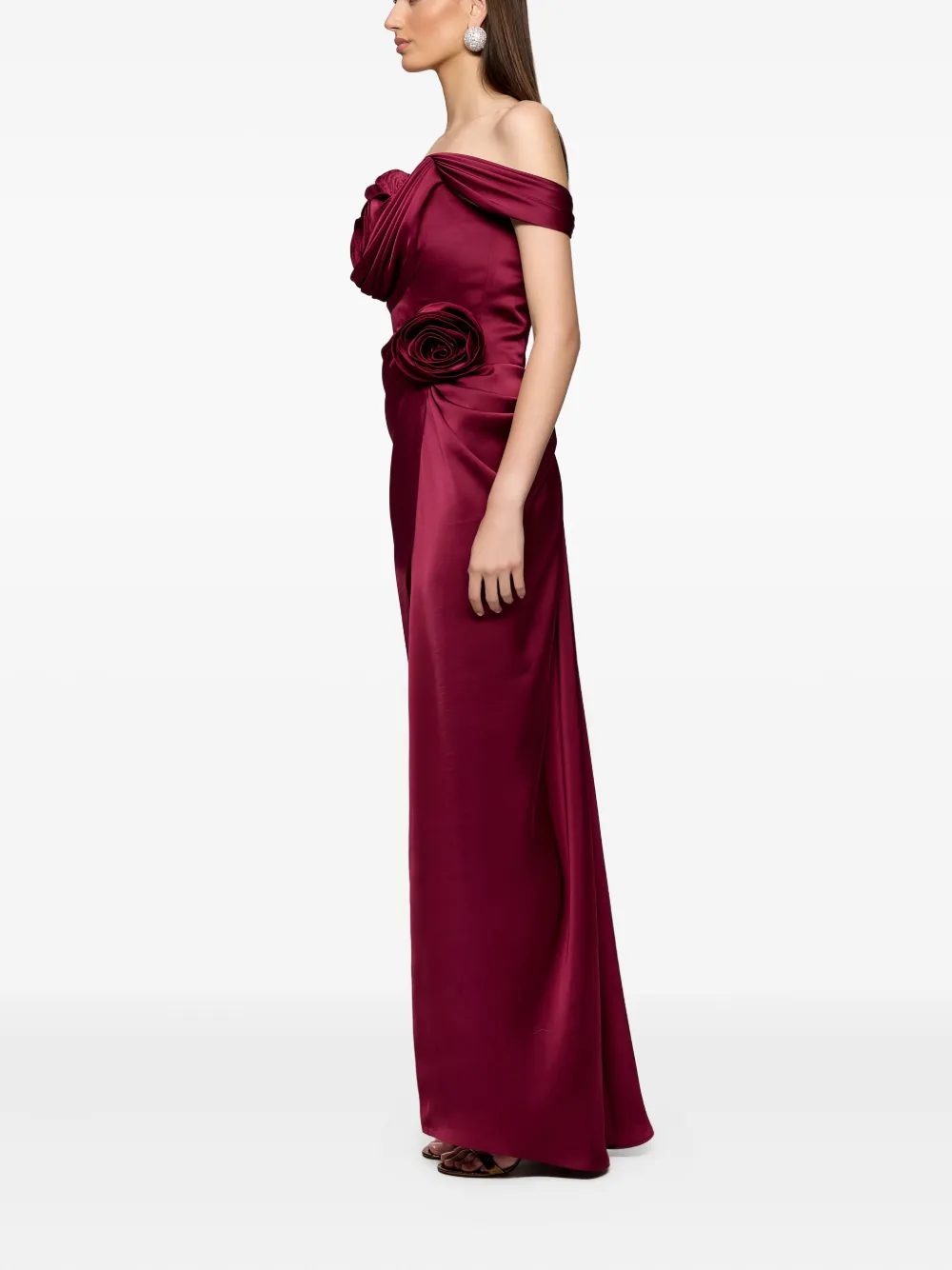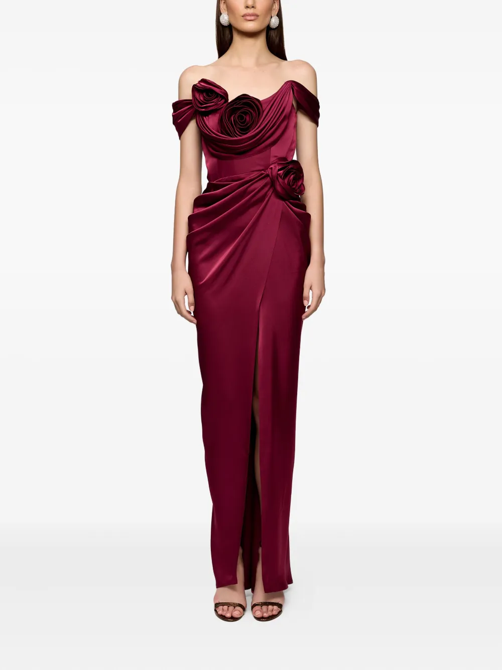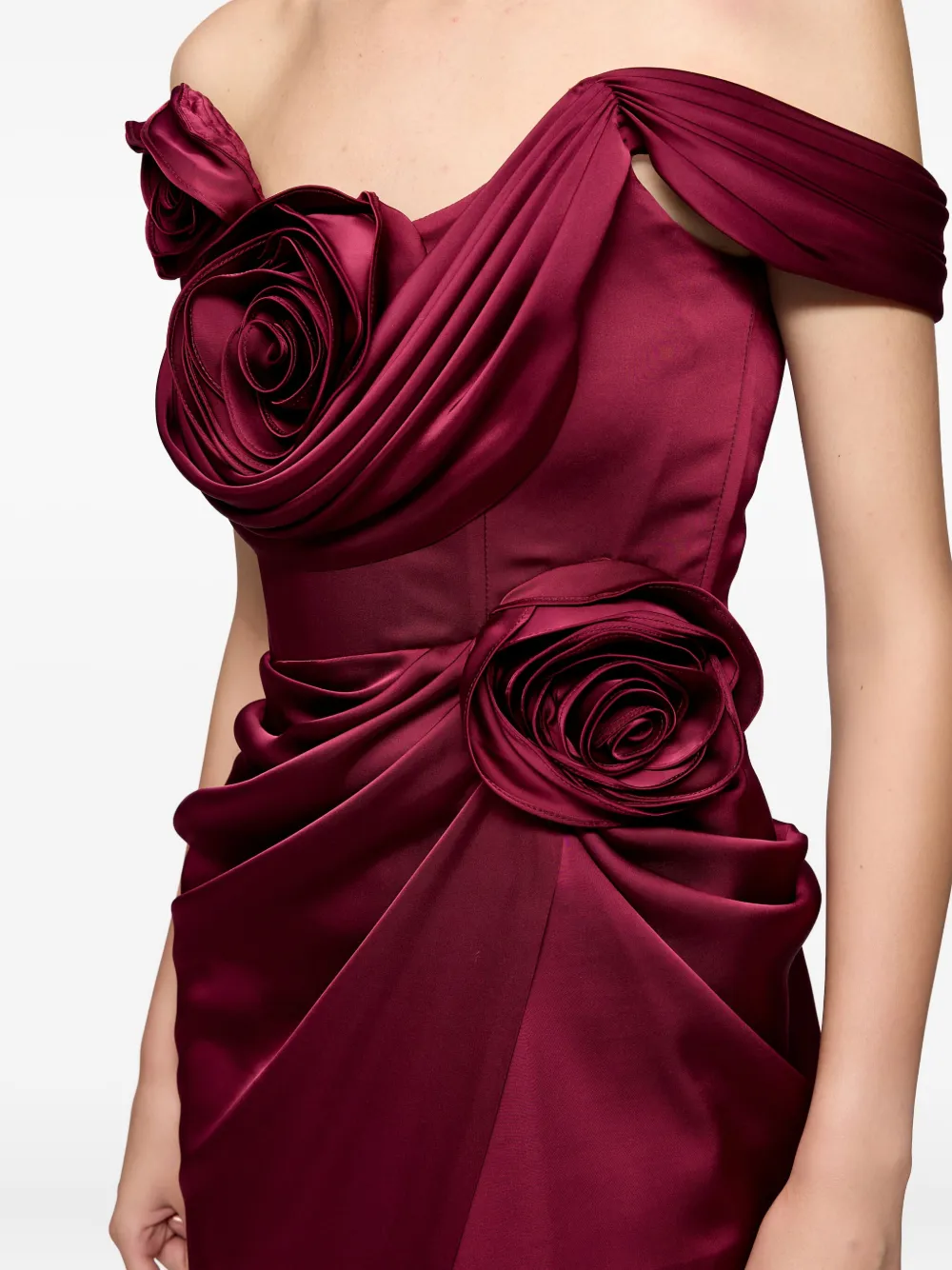Бордовый вырез с открытыми плечами, драпированные детали, украшения в виде роз