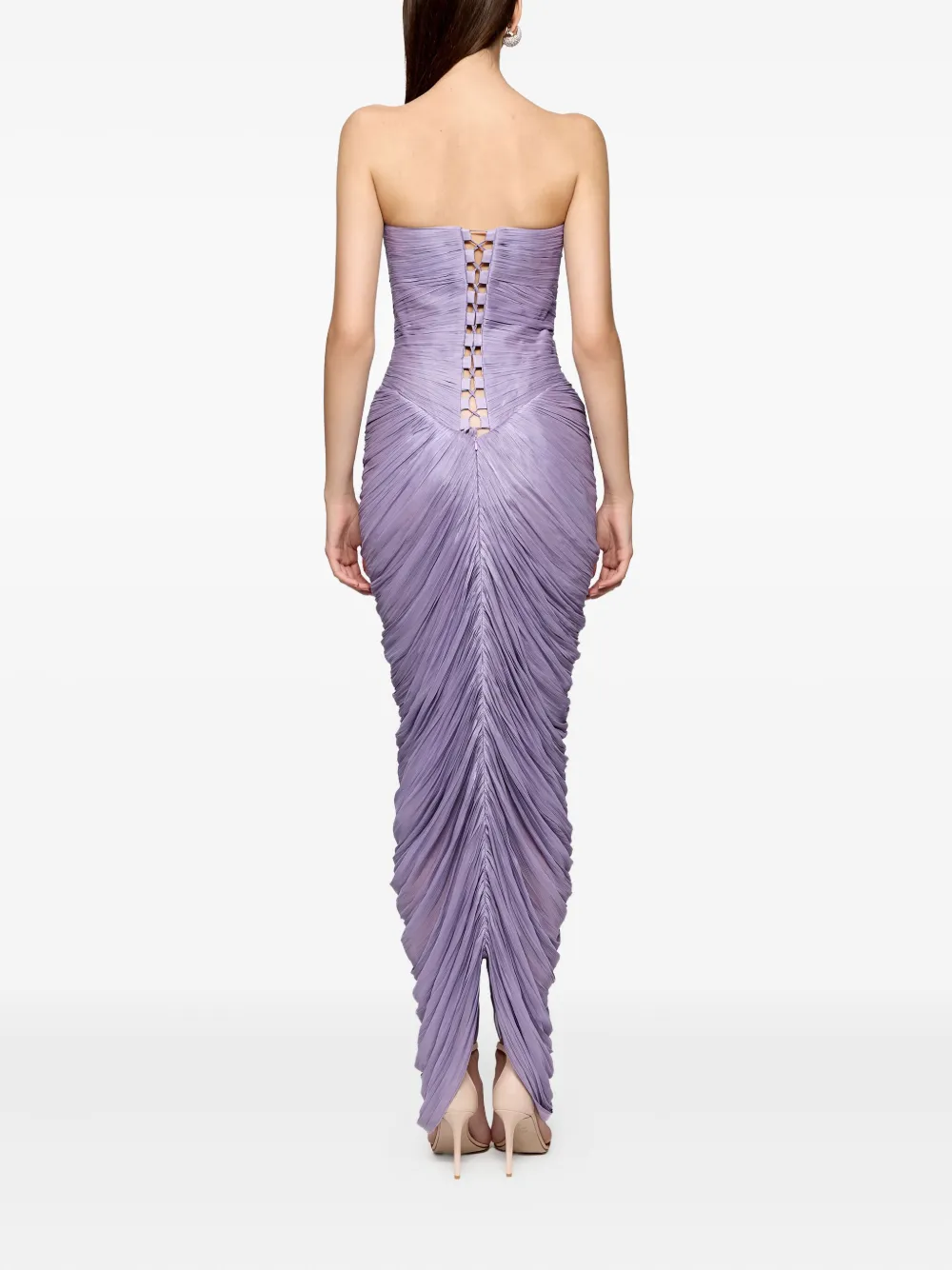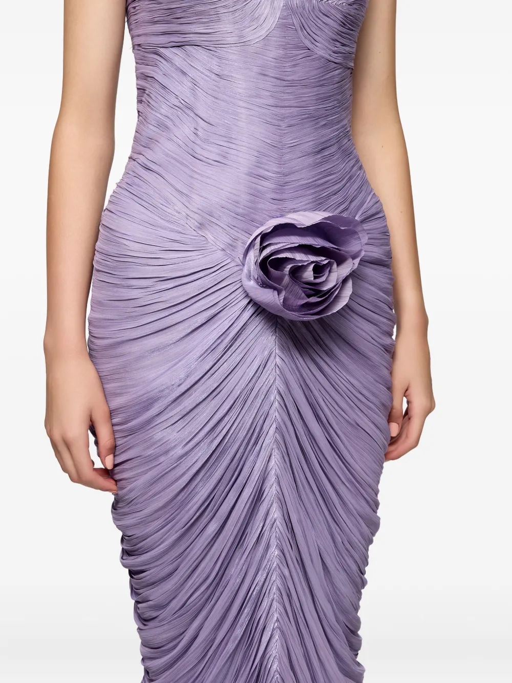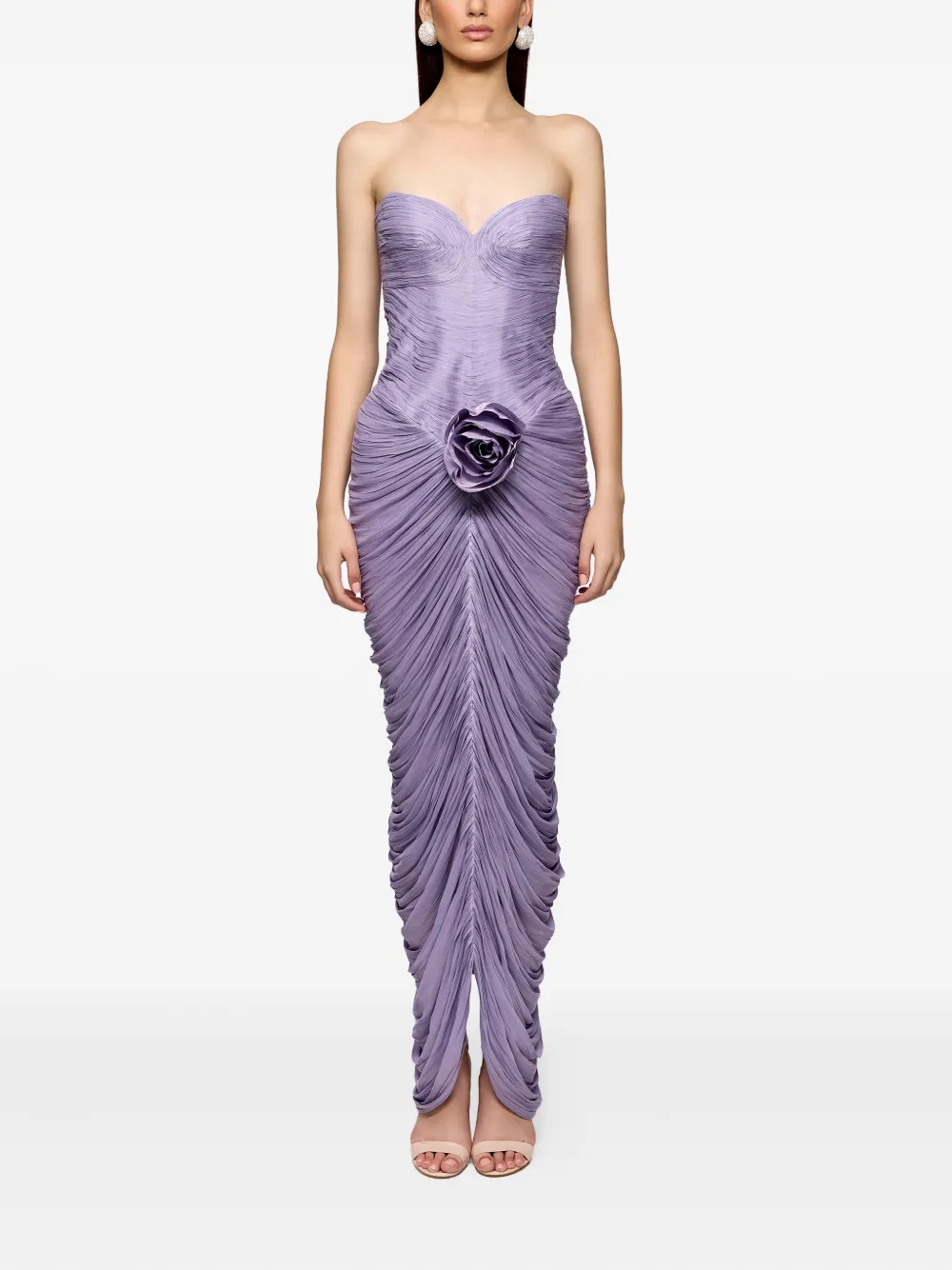 Фиолетовое платье без бретелек, плиссированные детали, драпированные детали, украшение в виде розы