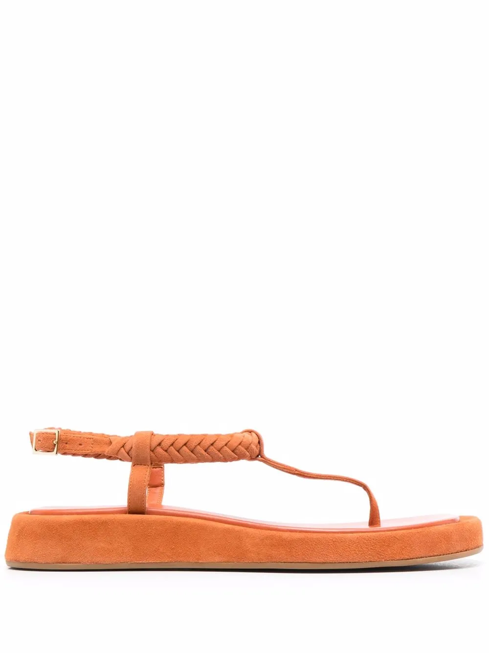 Плетеная отделка, открытый носок, стелька с логотипом и плоская резиновая подошва.