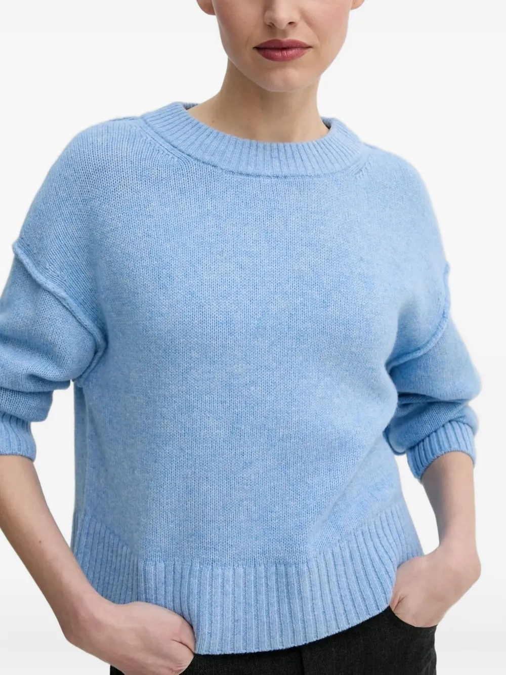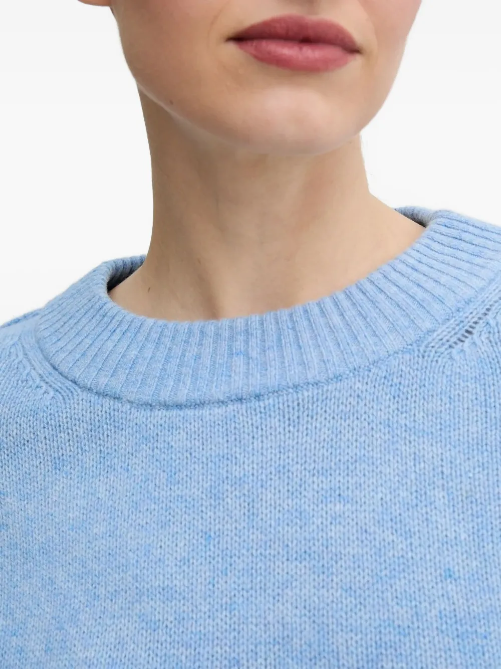 Светло-голубой ребристый подол, круглый вырез, длинные рукава, слегка спущенные плечевые швы.