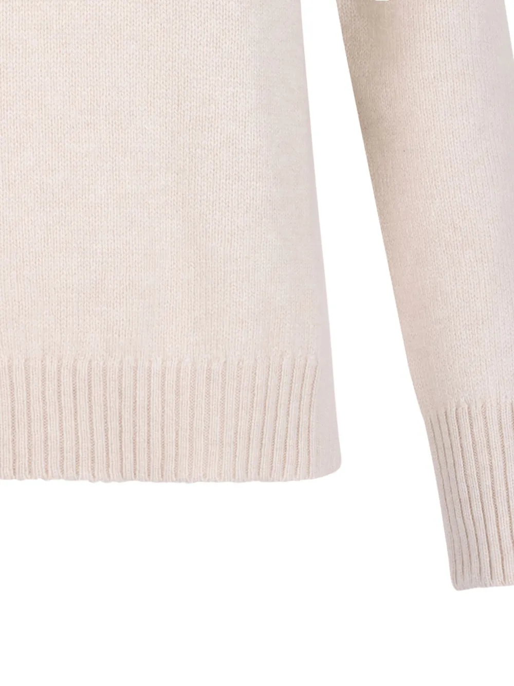 Круглый вырез белого цвета, длинные рукава, ребристые манжеты, ребристый подол, гладкая вязка