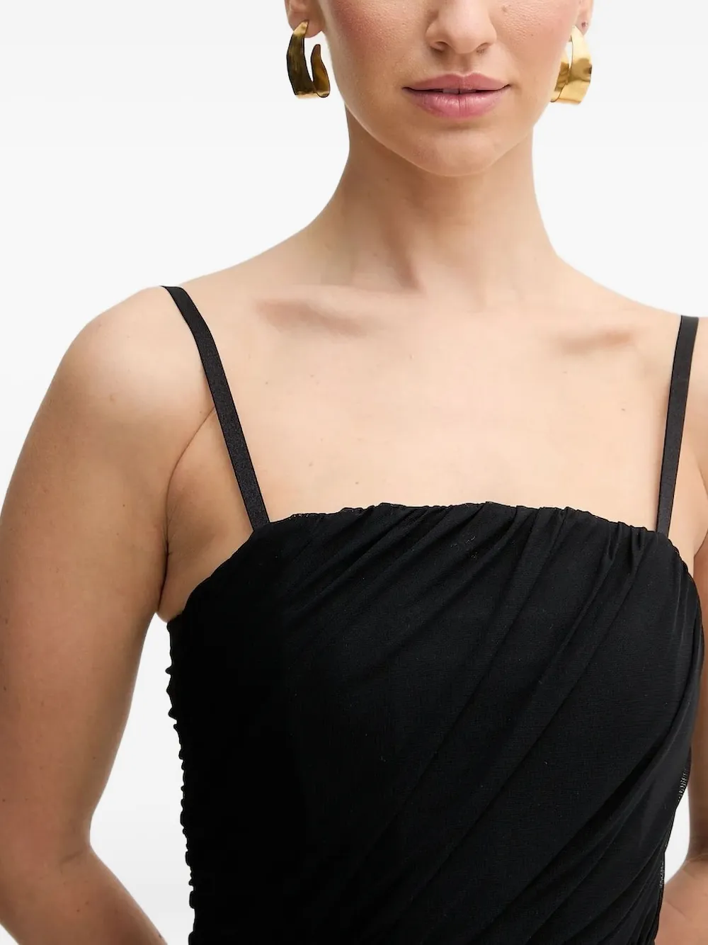 Черная юбка на тонких бретельках, с рюшами и приталенным лифом, присборенная, длина мини