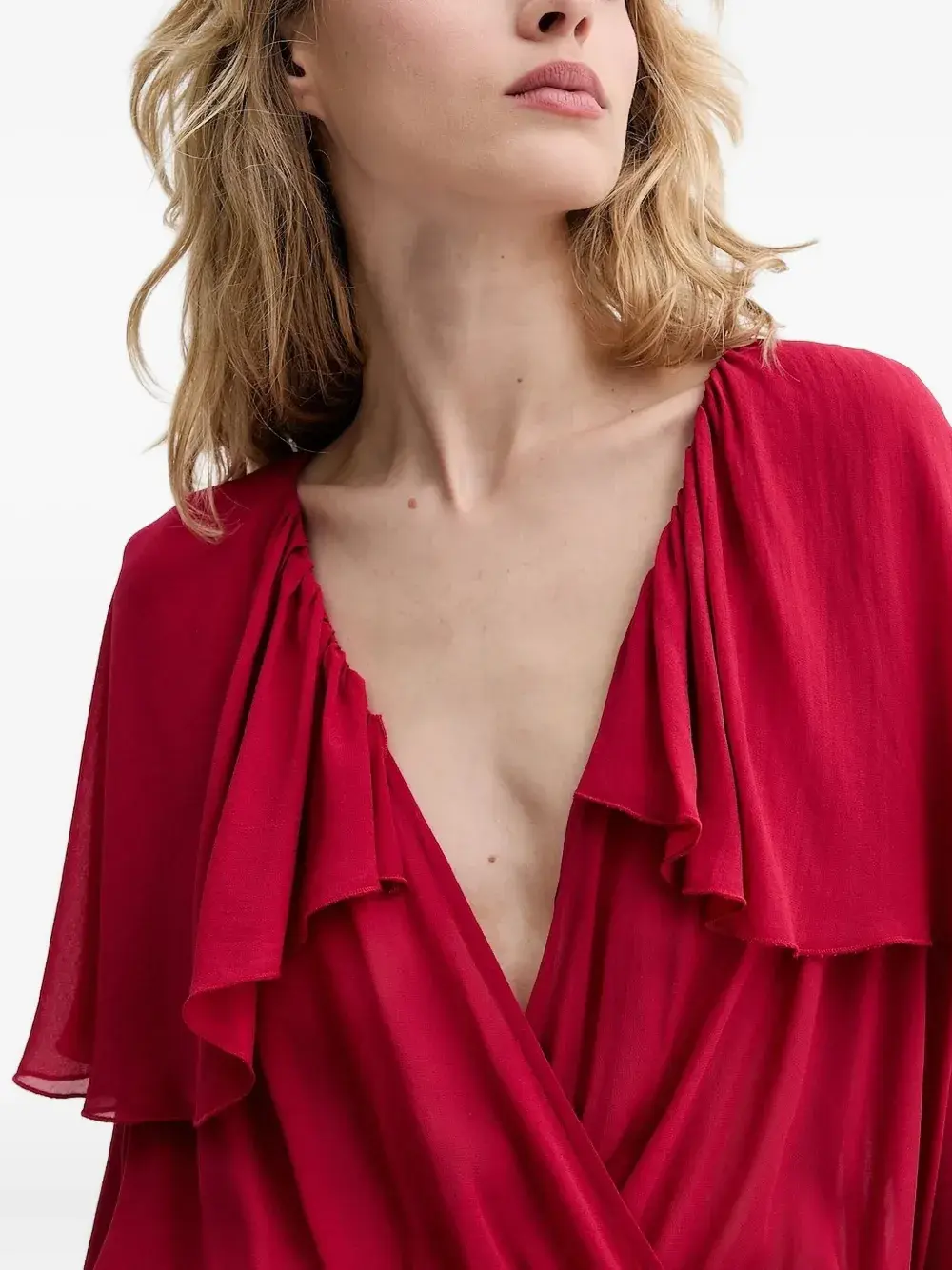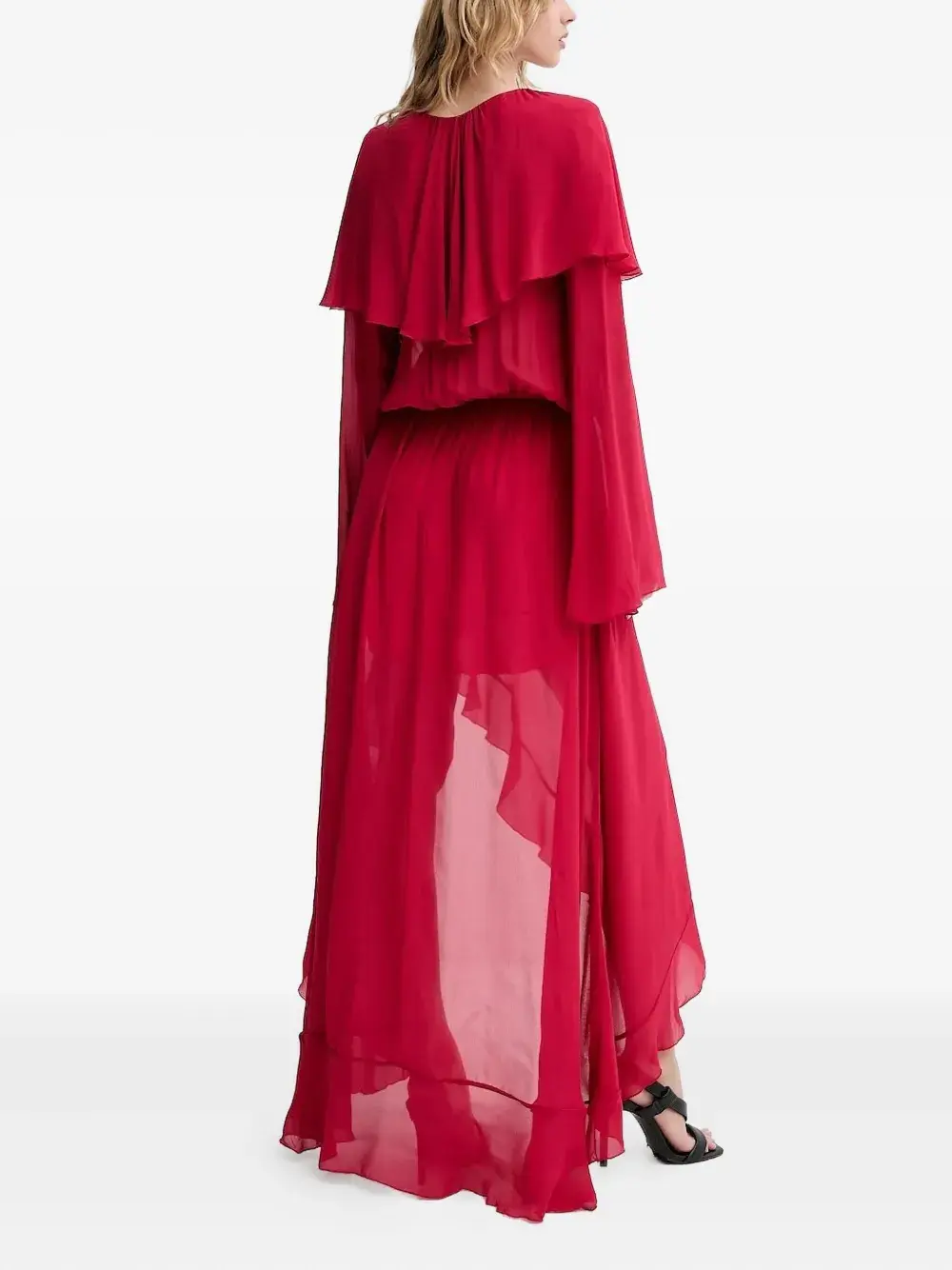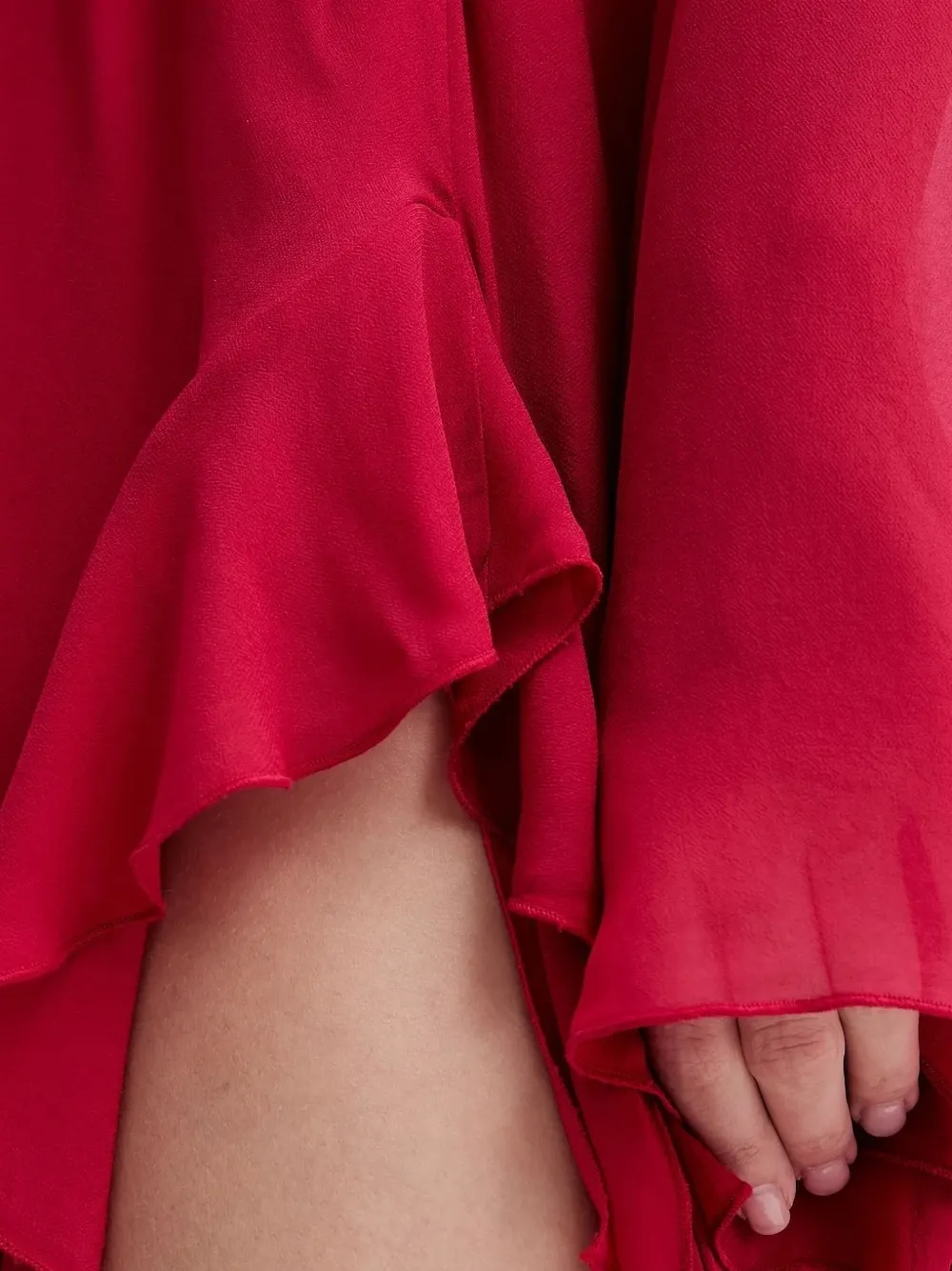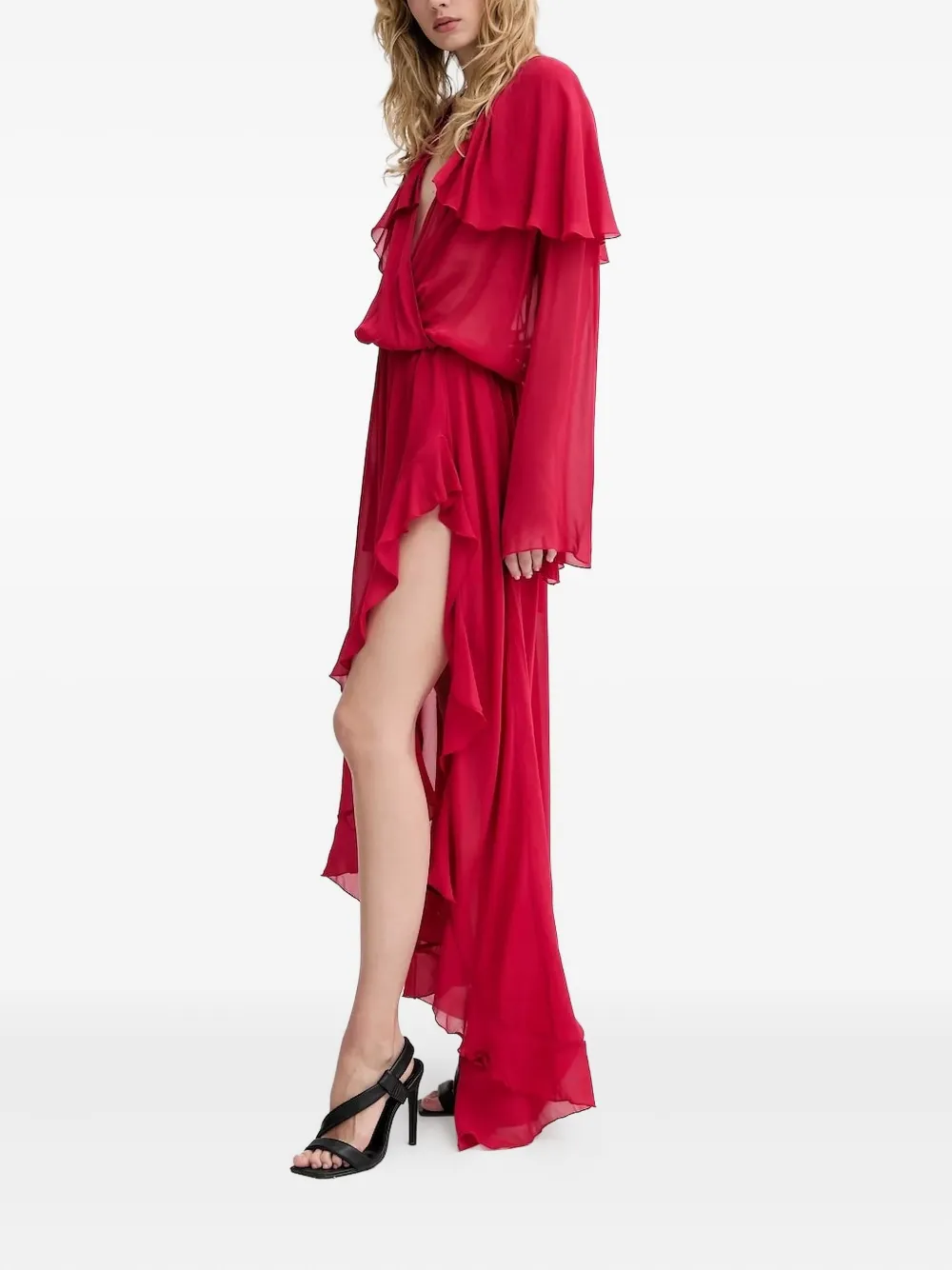Красные многослойные оборки, лиф-халат, асимметричный подол, длинные рукава.