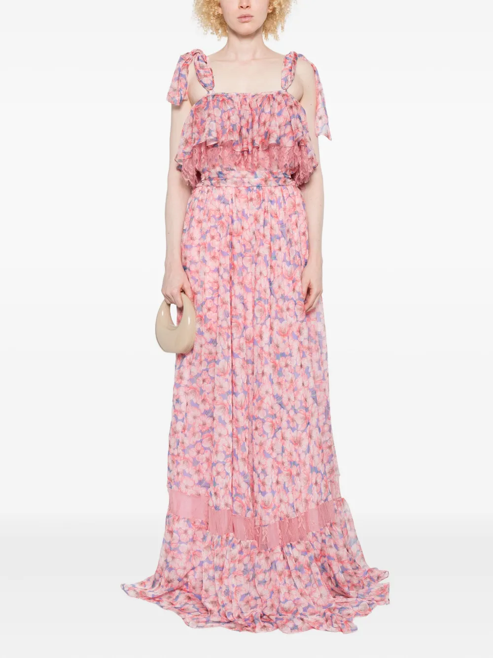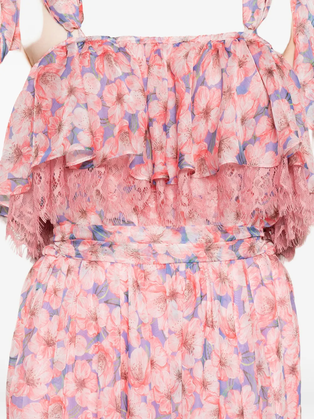 Розовый цветочный принт, лиф с оборками, завязки на бретельках, многоярусная юбка с кружевной отделкой.
