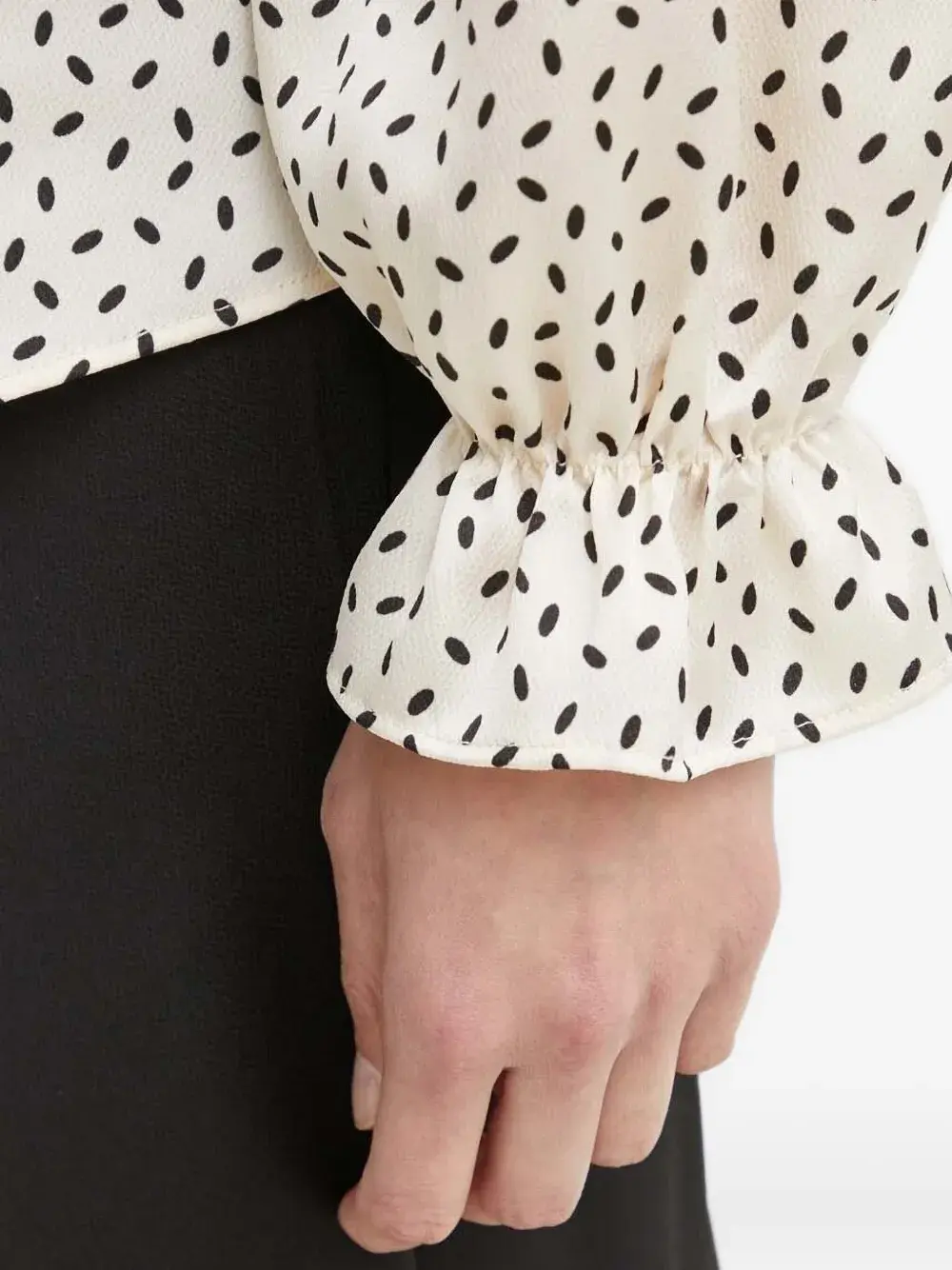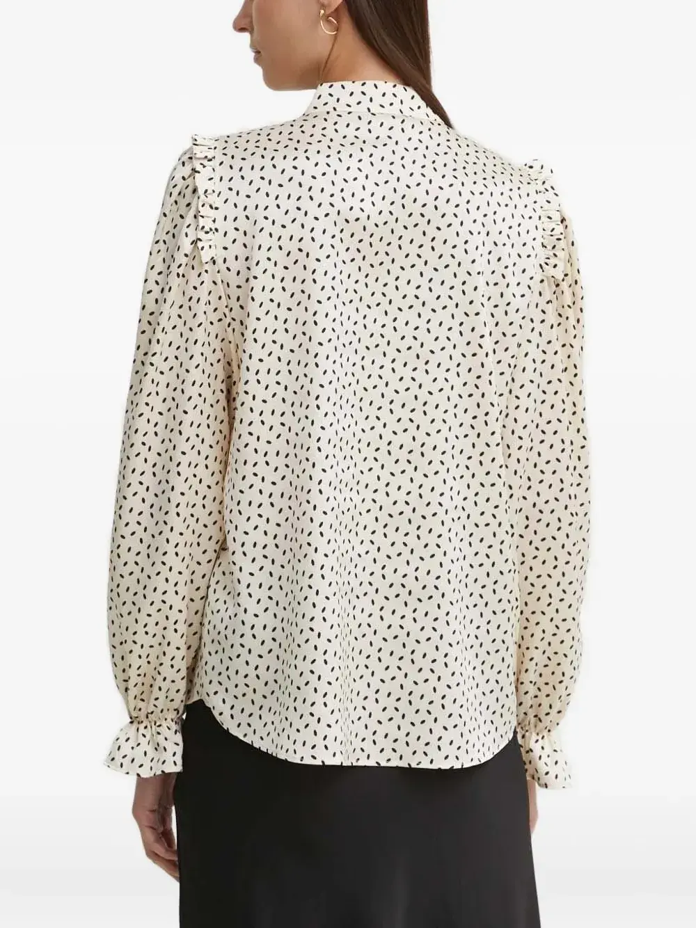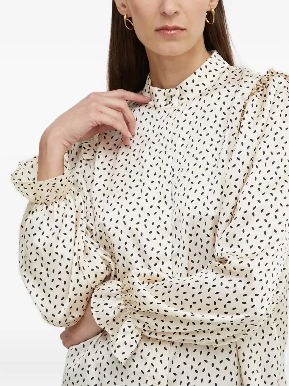 Белый принт, оборки на плечах, оборки на манжетах, воротник-стойка, длинные рукава.