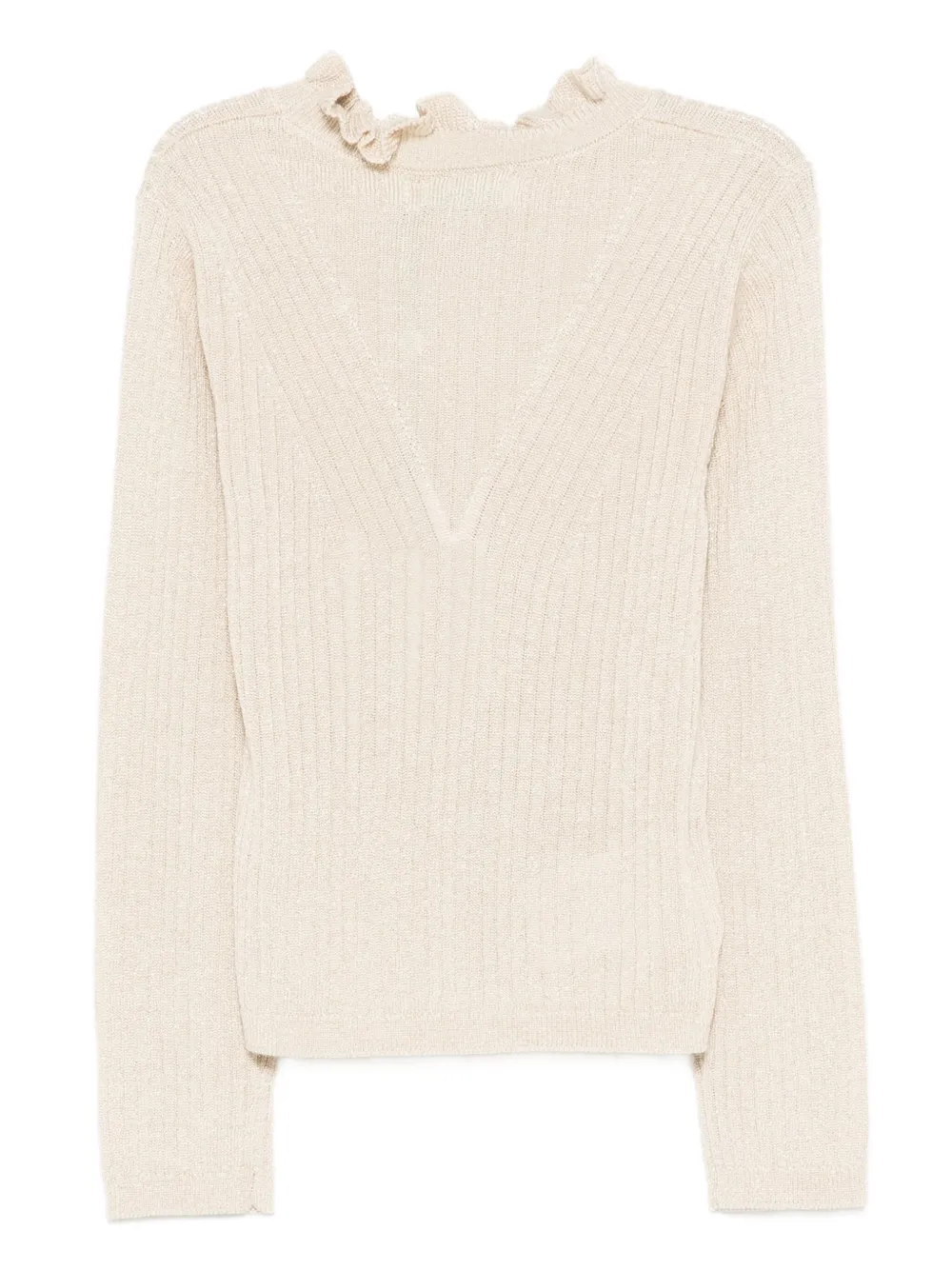 Кремово-белый оборчатый вырез, ребристая текстура, металлический эффект, длинные рукава, логотип.