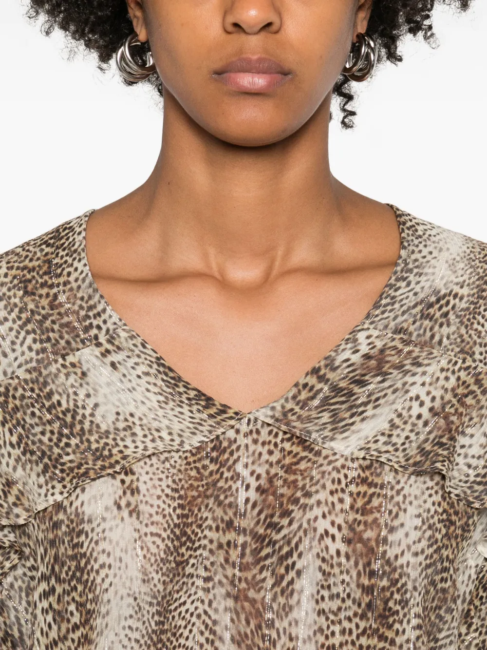 Бежевый анималистичный принт, V-образный вырез, многослойные оборки, длинные рукава.