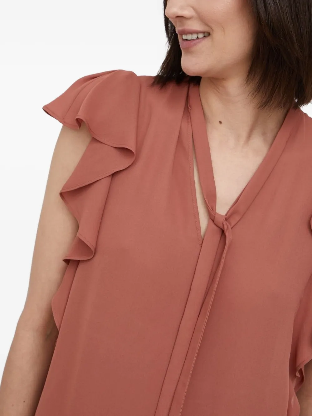 Коричневые рукава с оборками, завязка на шее, V-образный вырез.