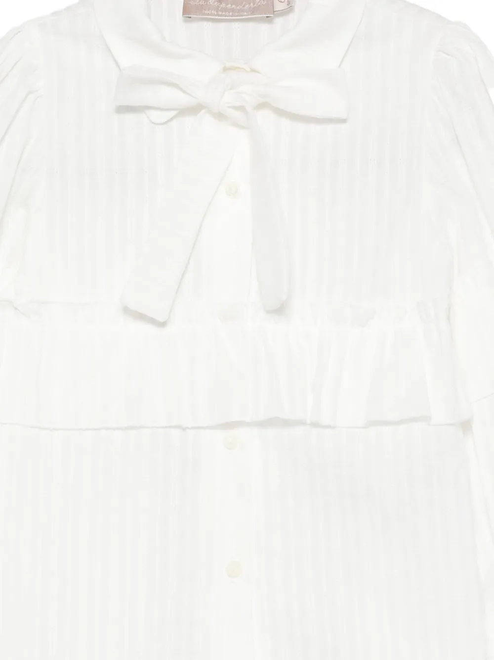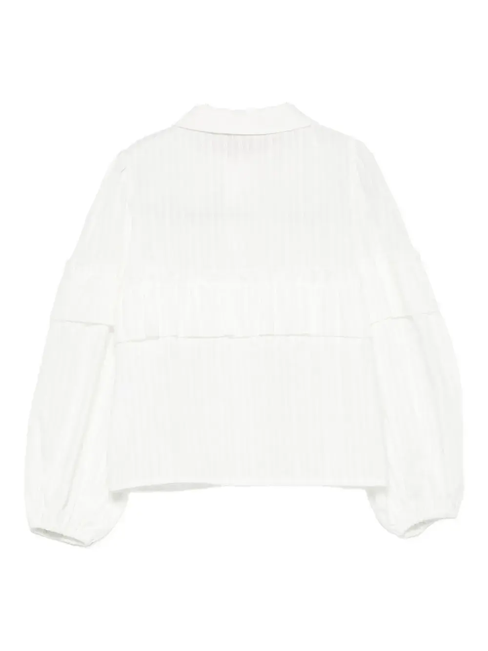 Белая застежка на пуговицы спереди, рукава-буфы, отделка воланами, вертикальные полосы, завязывающийся галстук.