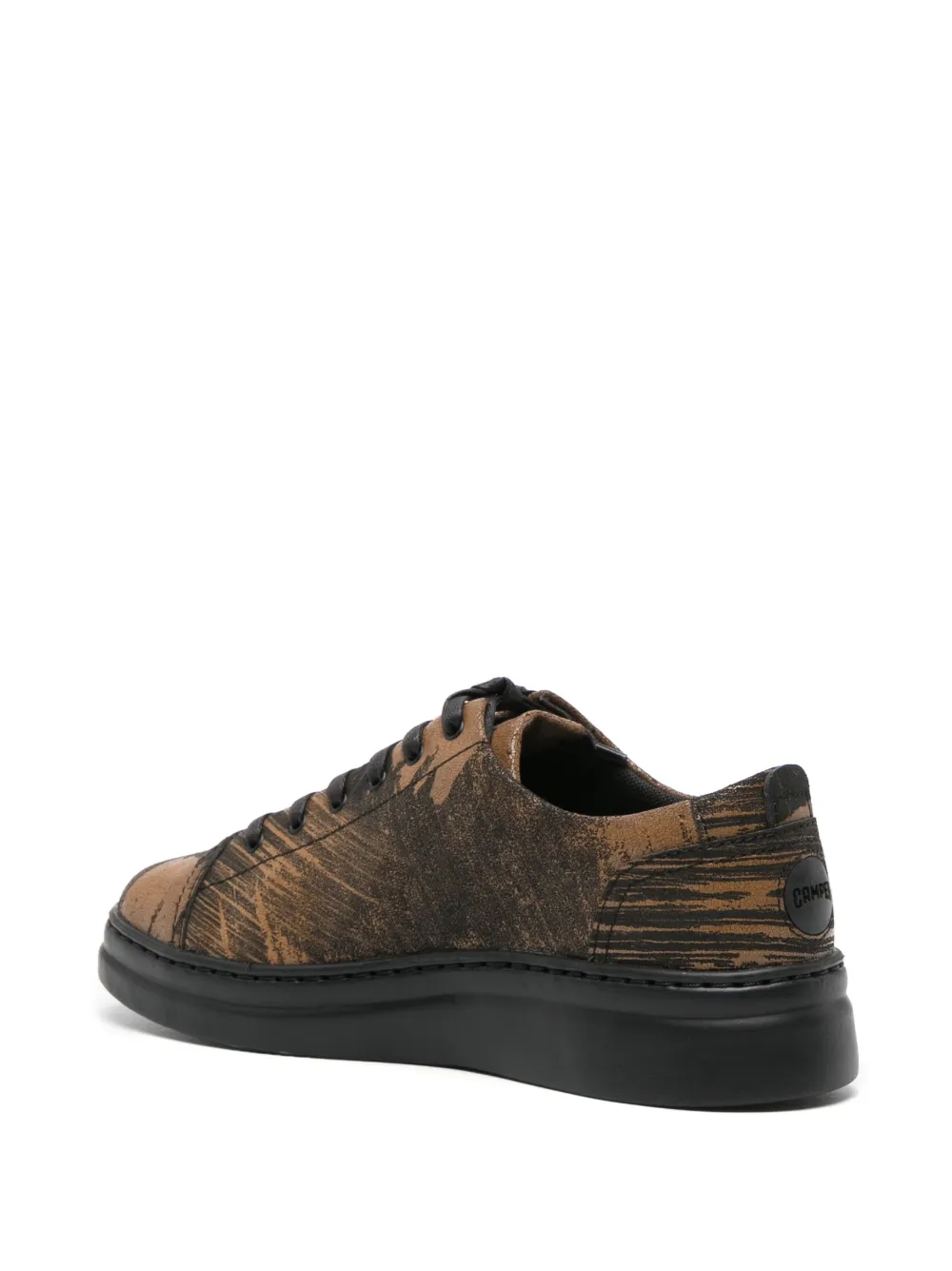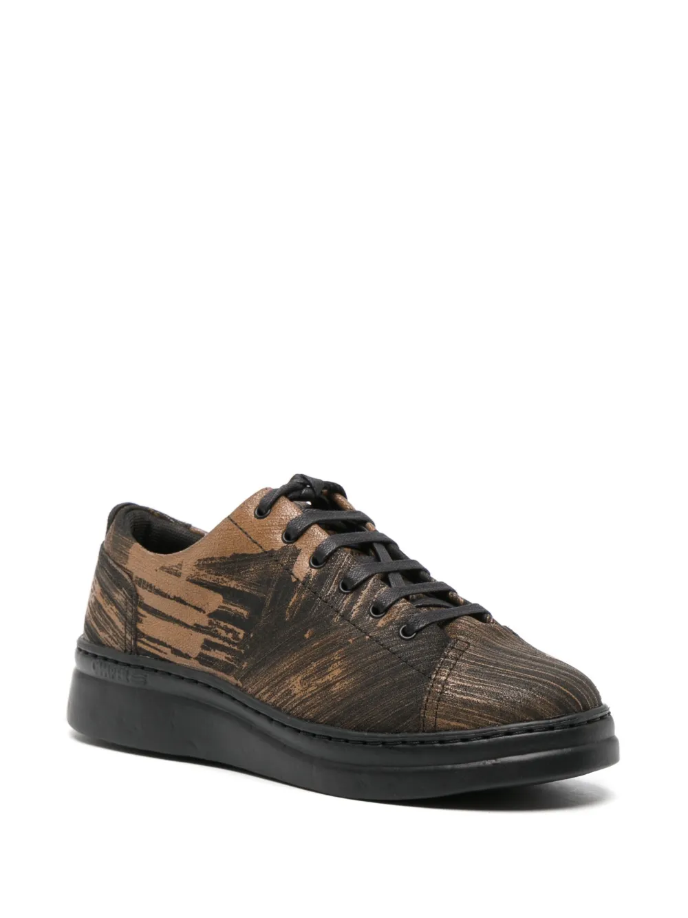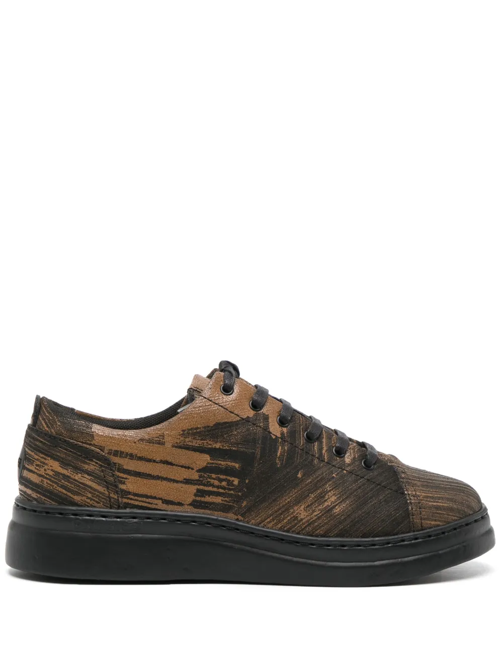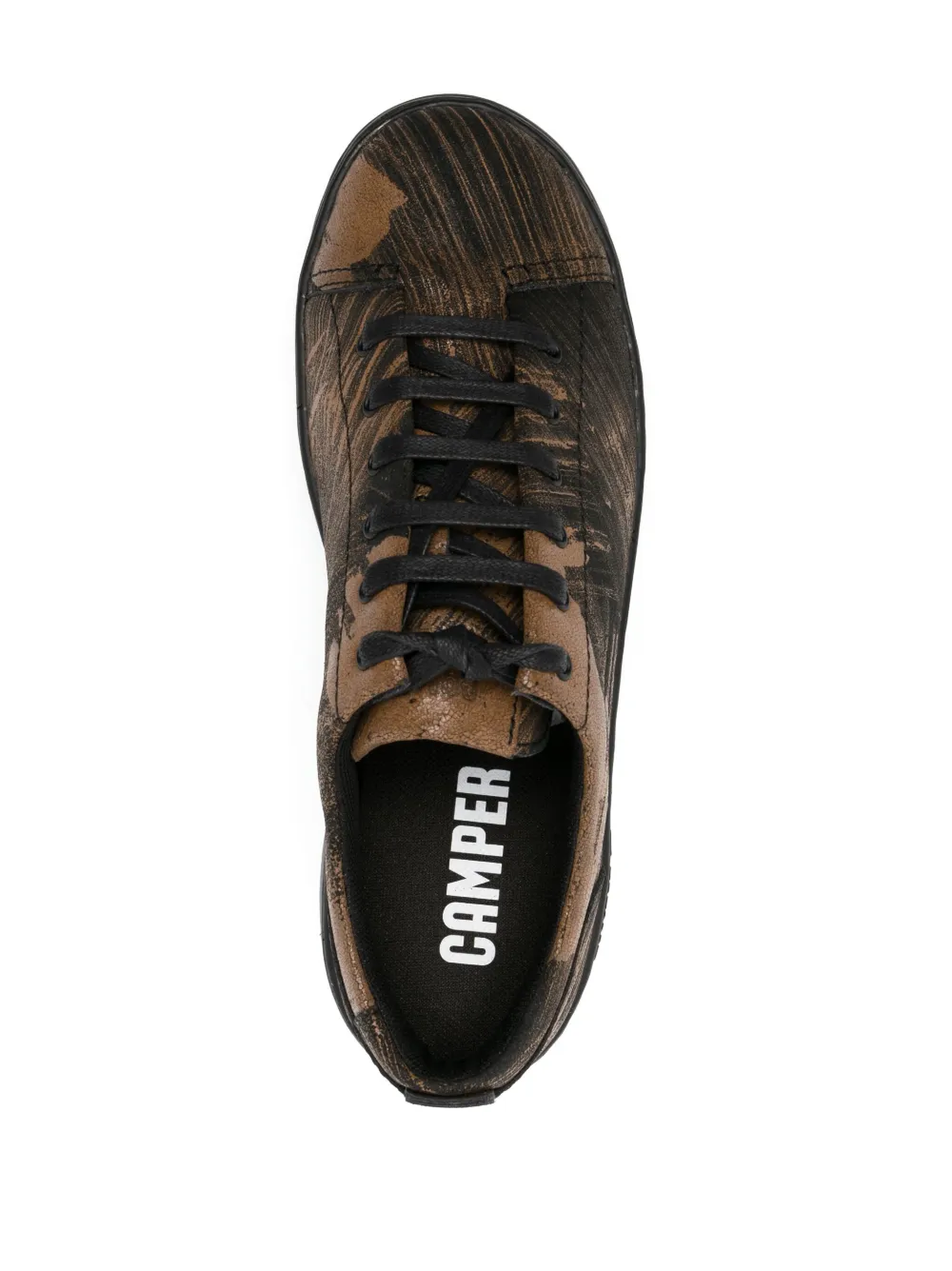 Коричневый, черный, телячья кожа, живописный принт, стелька с логотипом, нашивка с логотипом сзади, закругленный носок, шнуровка спереди и плоская резиновая подошва.