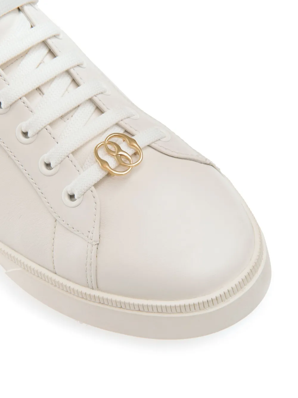 Белый, телячья кожа, золотистый металлический логотип, тисненый логотип сбоку, закругленный носок, шнуровка спереди и плоская резиновая подошва.