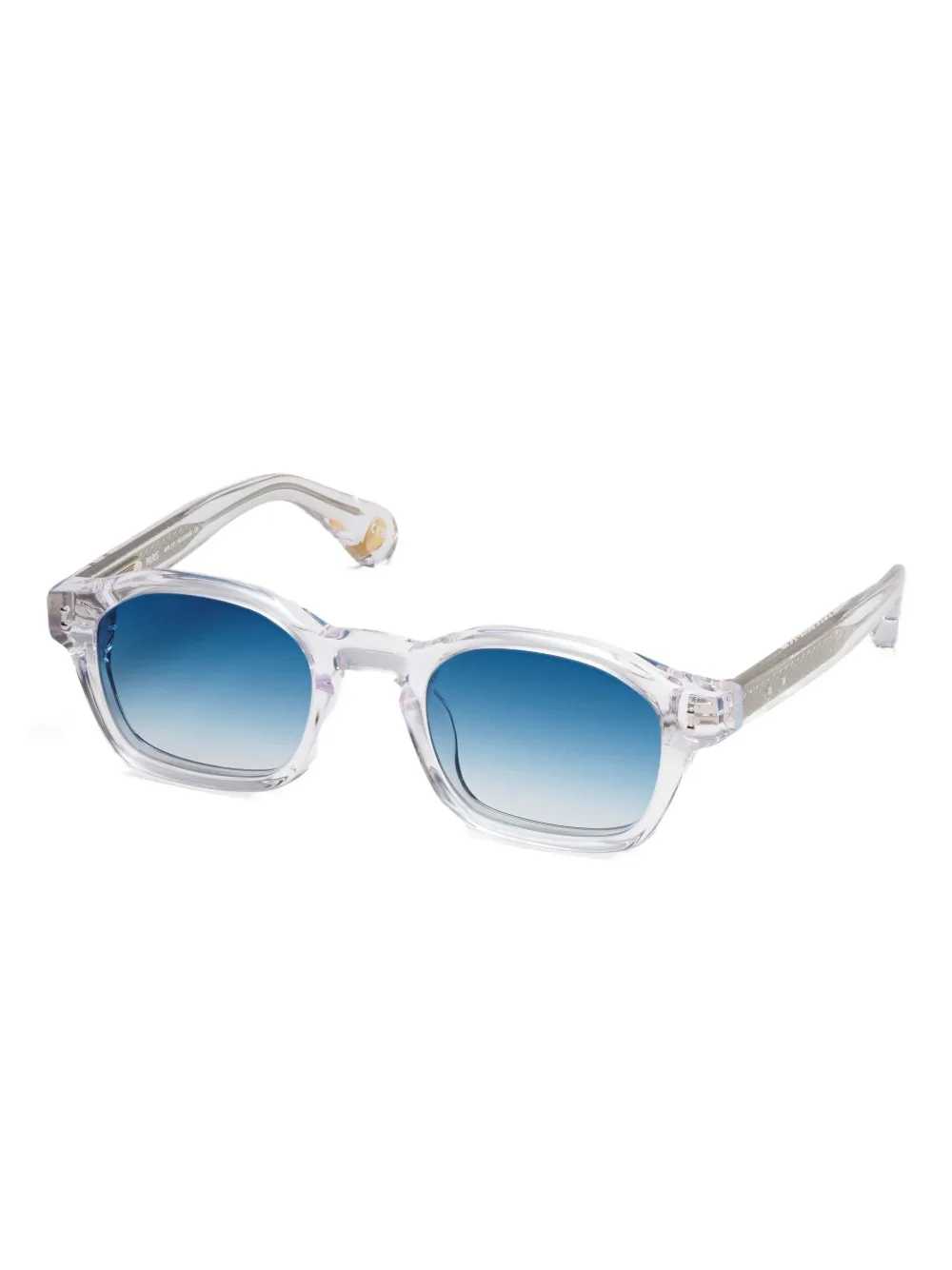 Бело-голубые градиентные линзы, прямоугольная оправа. Очки поставляются с защитным футляром.