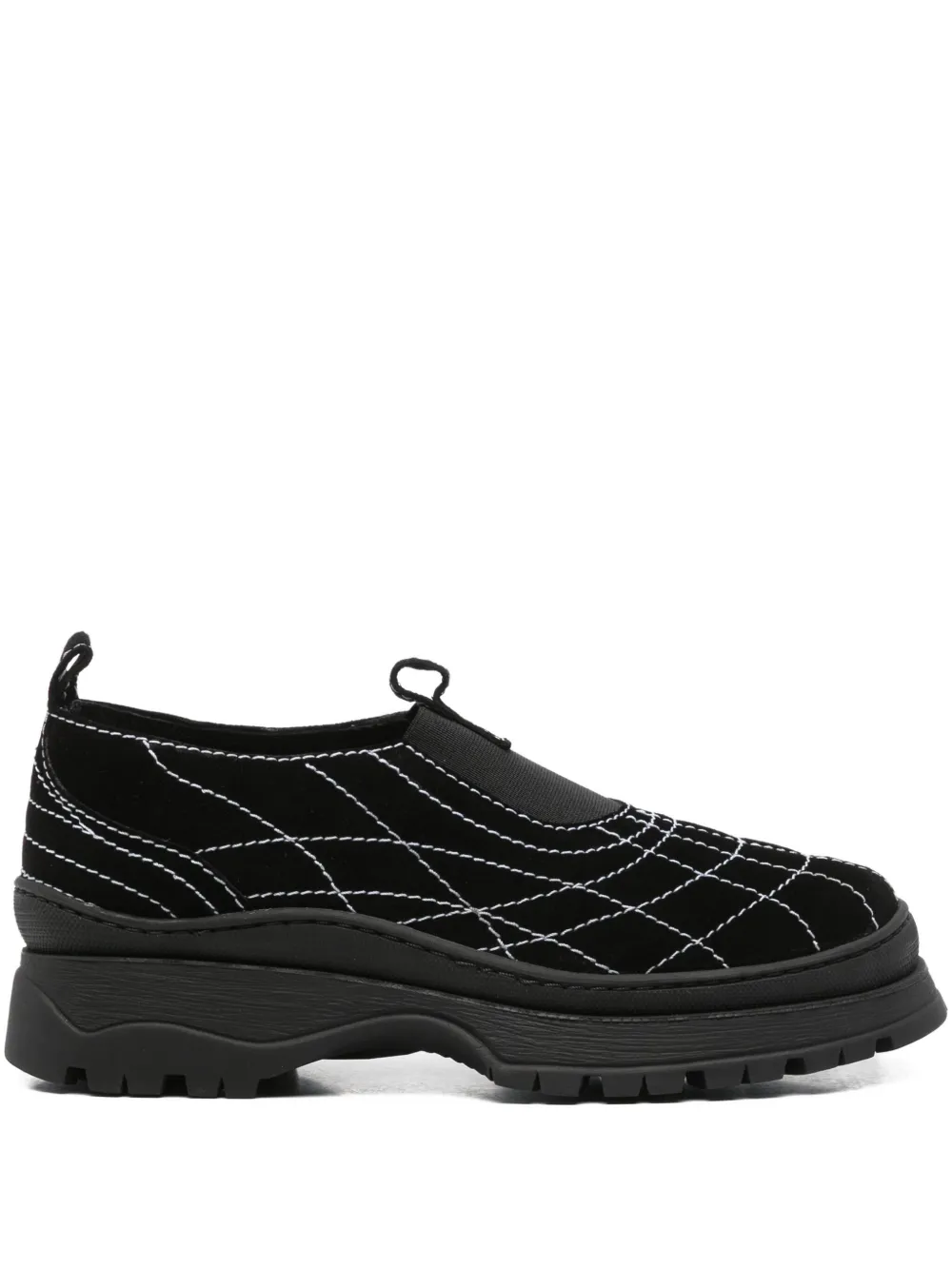 Черная замша, белая резиновая подошва с декоративной строчкой