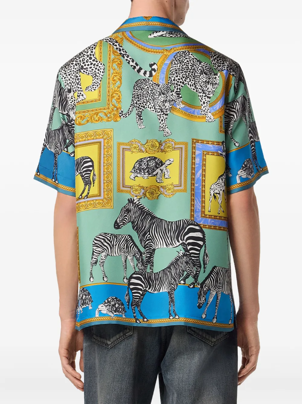 Синий шелк, короткие рукава, зазубренный воротник, принт Versace Safari