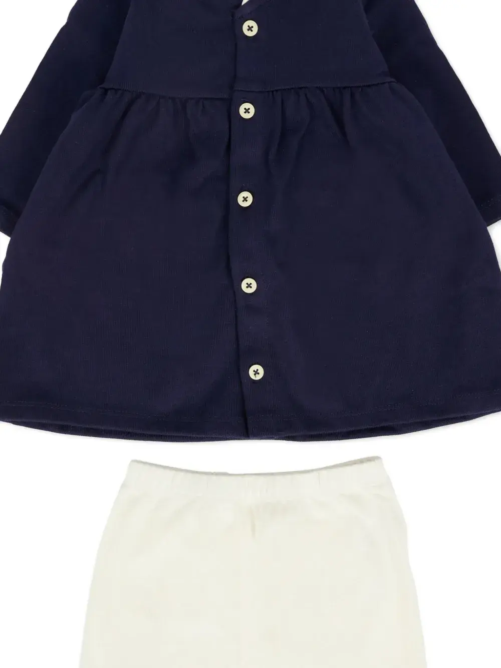 Комплект из двух предметов из органического хлопка темно-синего цвета с матросским воротником, застежкой на пуговицы и длинными рукавами.