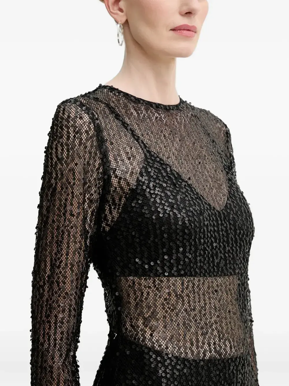 Черная ткань с пайетками, прозрачная сетка, длинные рукава, круглый вырез, длина миди. Изделие отличается очень деликатной отделкой. Обращайтесь с ним крайне осторожно, чтобы избежать повреждений, таких как поломка перьев или потеря пайеток.