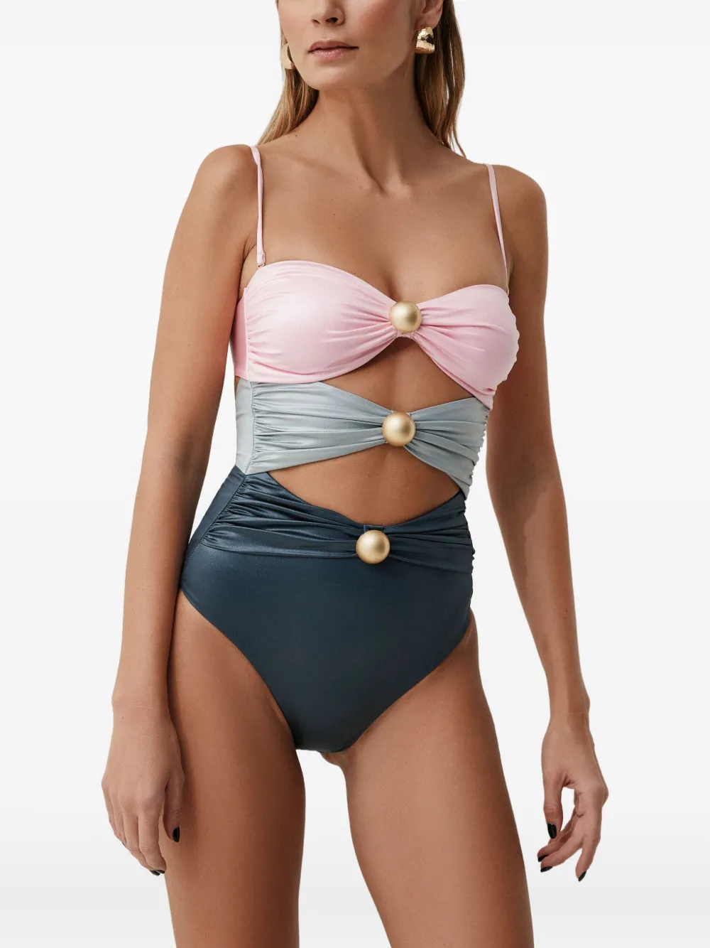 Украшения оттенка розового золота, вырезной дизайн, трехцветные вставки, топ без бретелек. Будьте внимательны, примеряя купальники поверх своей одежды.