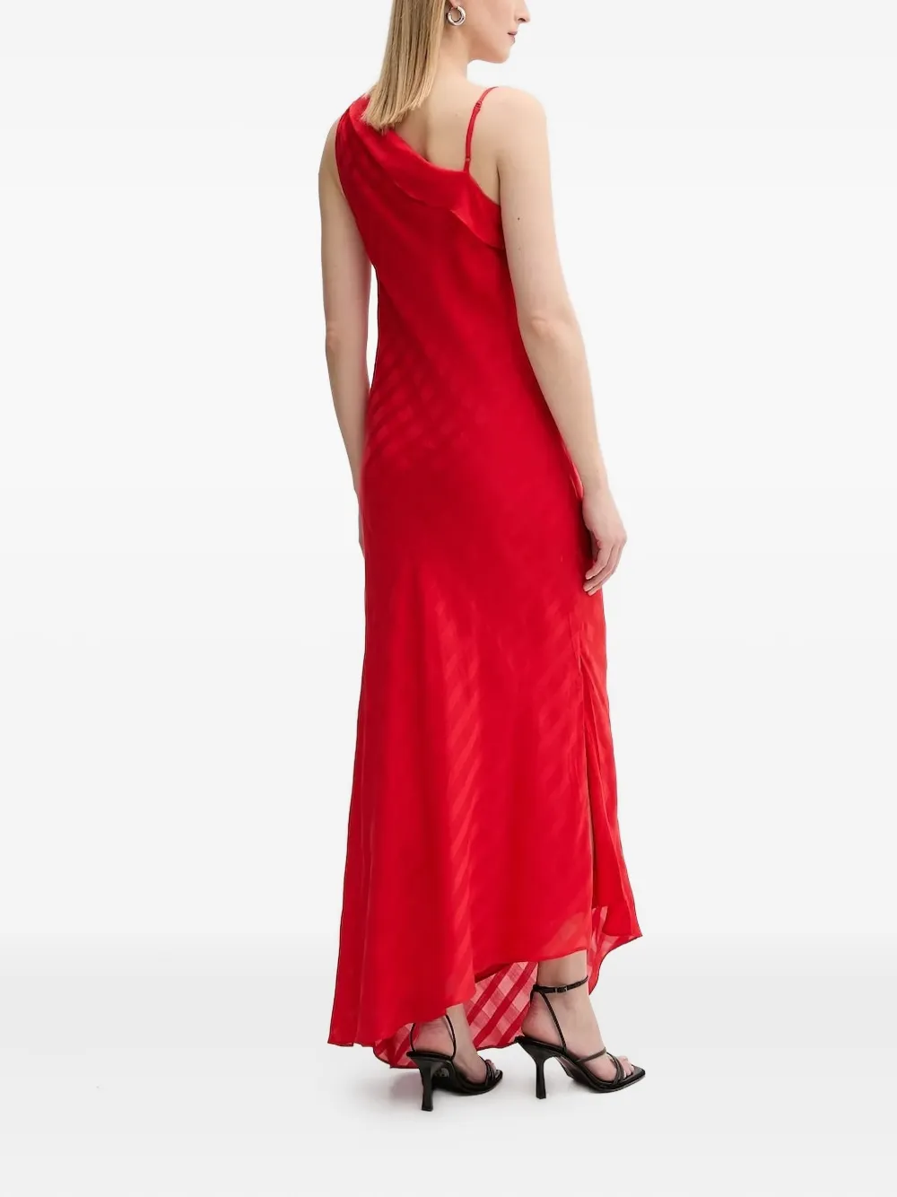 Красный вырез на одно плечо, потайная молния, асимметричный подол, разрезы по бокам.