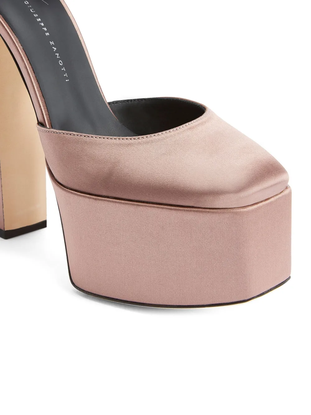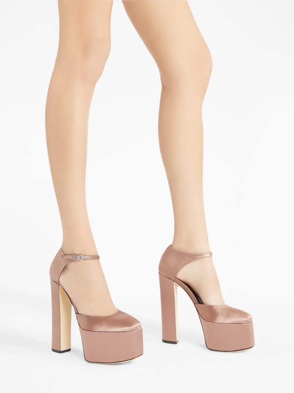Расцветка Blush Pink, кожа, сатиновая фактура, квадратный носок, ремешок на щиколотке с пряжкой, подошва на платформе, высокий блочный каблук и стелька с логотипом.