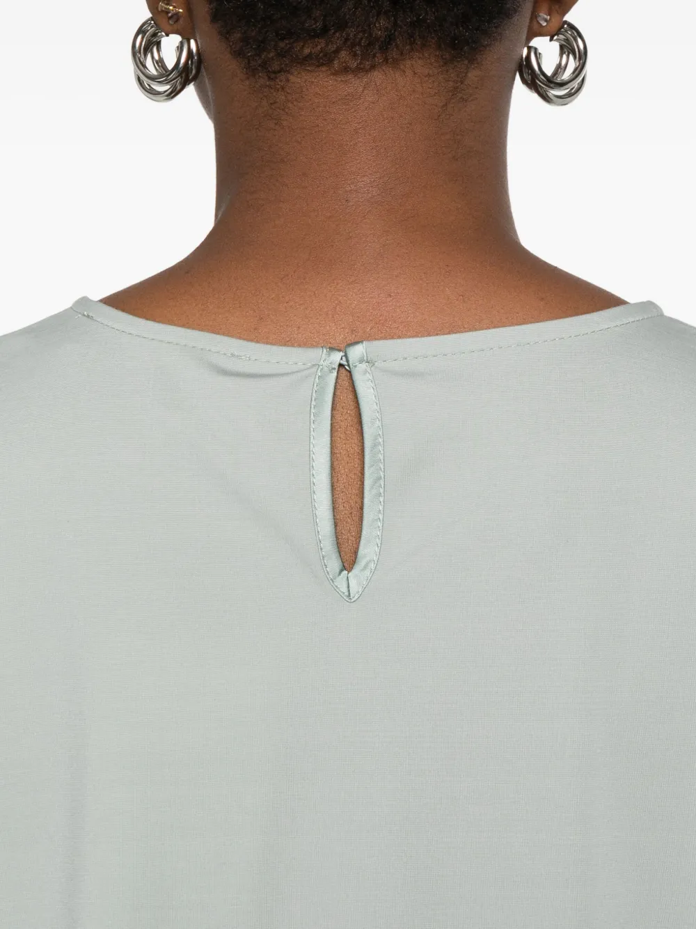 Светло-зеленый круглый вырез, короткие рукава, прямой подол, вырез-замочная скважина сзади.