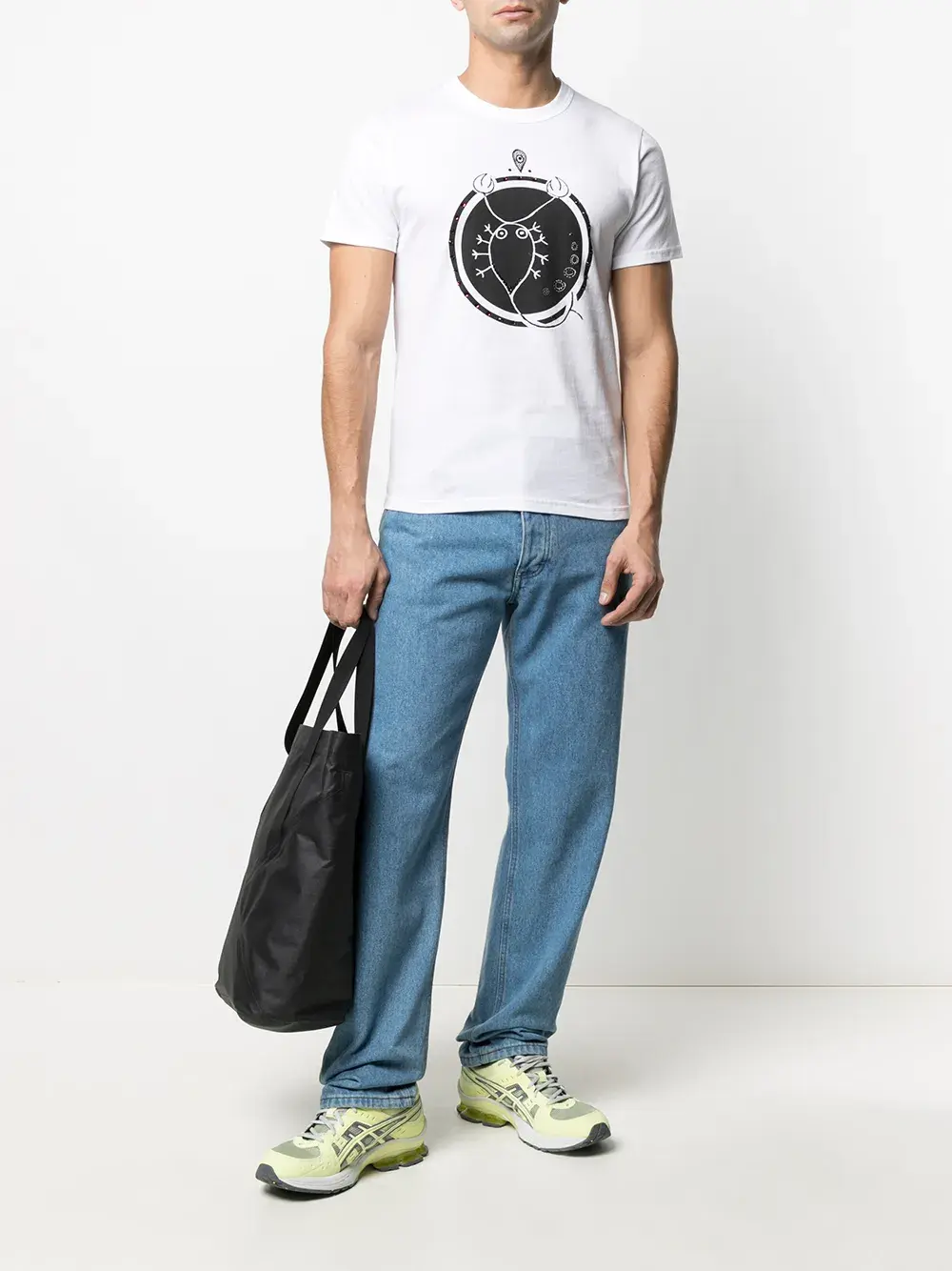 Круглый вырез, короткие рукава, прямой подол и графичный принт. Это унисекс-модель. Обратите внимание, что для нее используется мужская размерная сетка.
