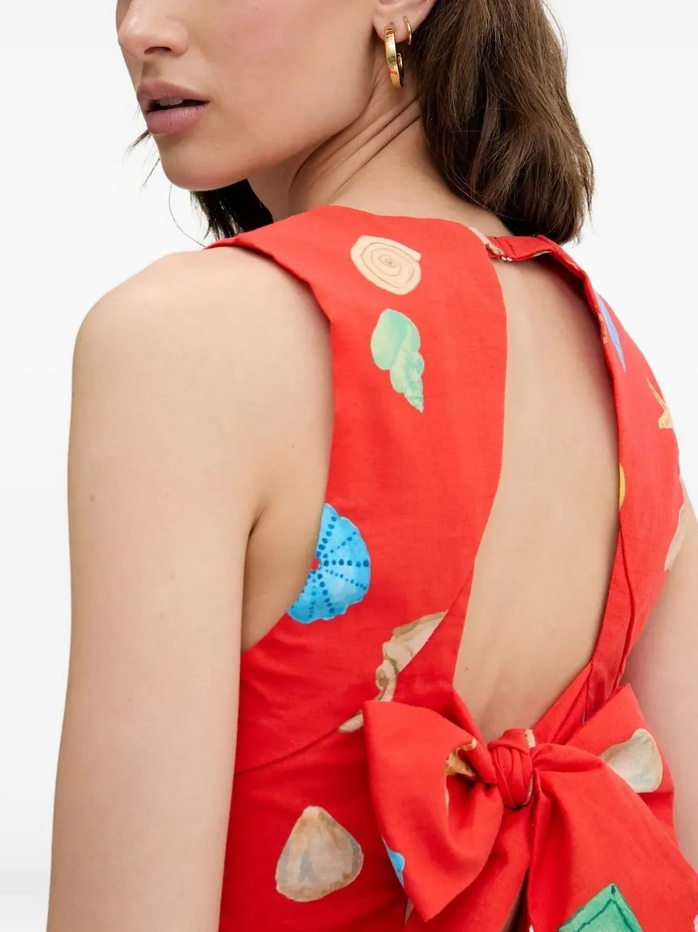 Красное платье без рукавов с принтом ракушек и квадратным вырезом, бантом сзади и открытой спиной