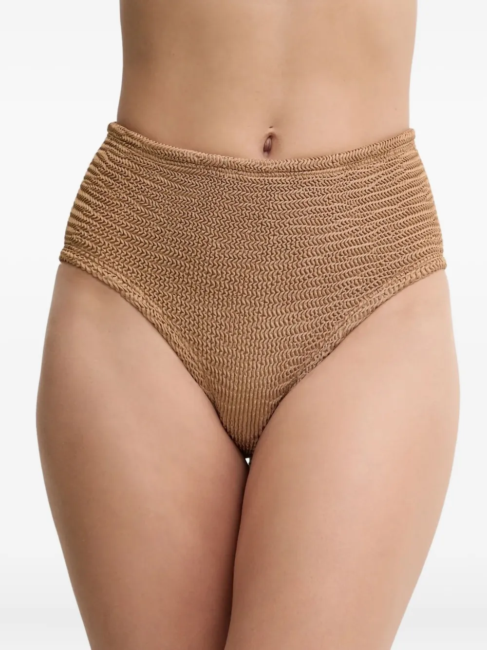 Плавки с высокой талией из ткани сирсакер цвета верблюжьей шерсти, топ-бандо. Обязательно примеряйте купальники поверх своей собственной одежды.