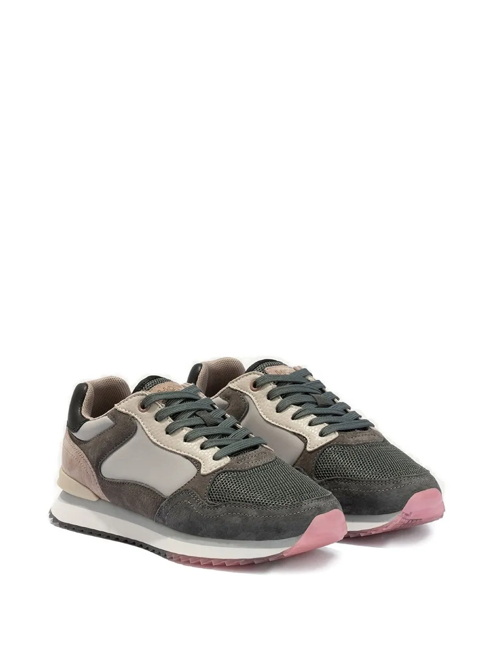 Серые замшевые вставки, сетчатые вставки, шнуровка, рельефная подошва, розовая деталь подошвы