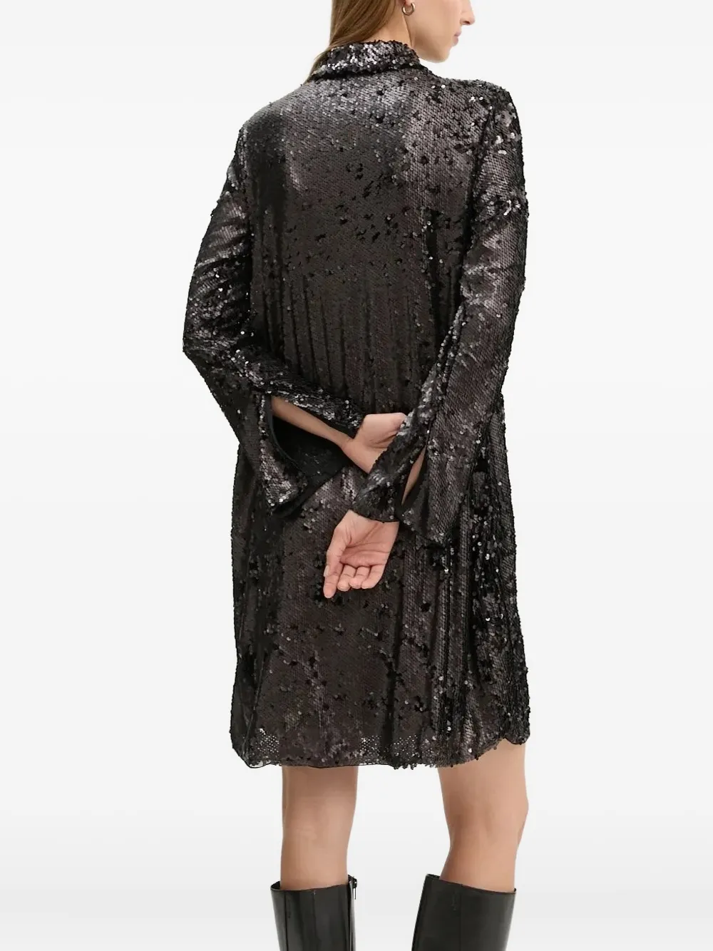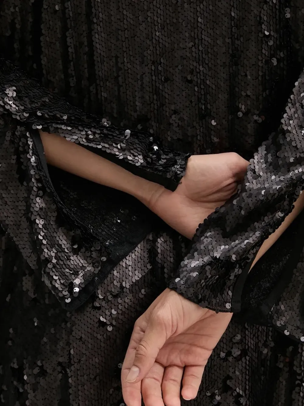 Украшения из черных пайеток, воротник-стойка, вырез-замочная скважина, длинные рукава.