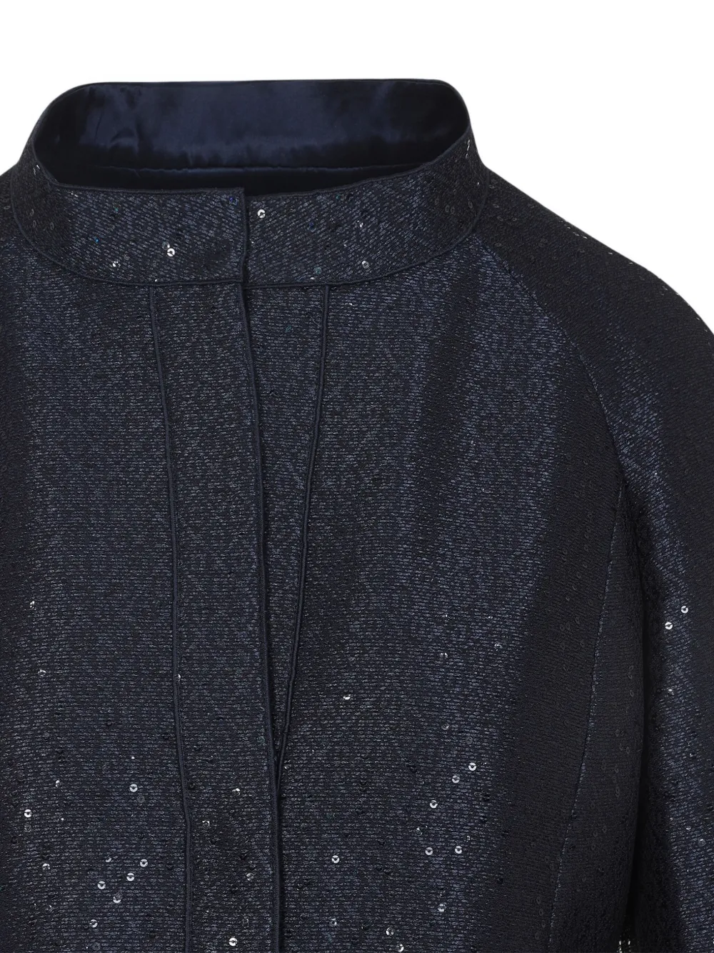 Синий воротник-стойка, отделка пайетками, длинные рукава, застежка-молния спереди.