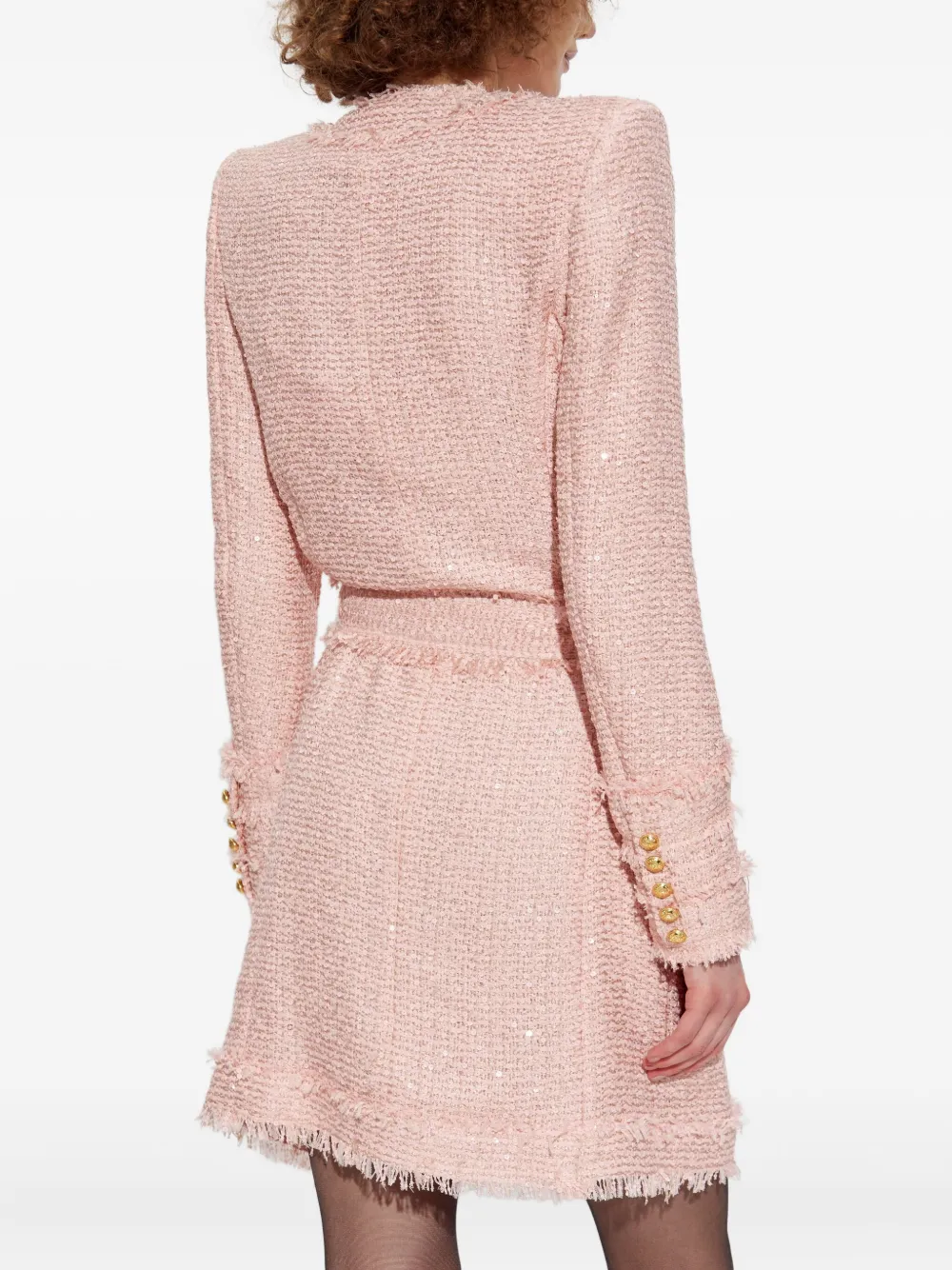 Розовый твид с отделкой из пайеток, необработанными краями, золотыми пуговицами, поясом на талии.