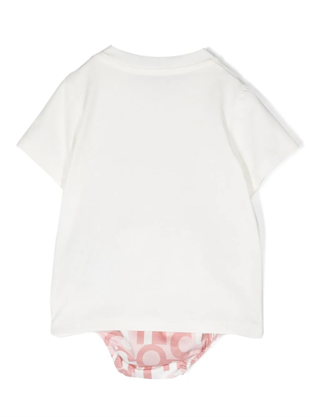 Белый, розовый, эластичный хлопок, модель из двух частей, монограмма, эластичный пояс, эластичные манжеты, ткань джерси, нашивка с логотипом на груди, застежка на кнопках на плече, круглый вырез, короткие рукава и прямой подол.