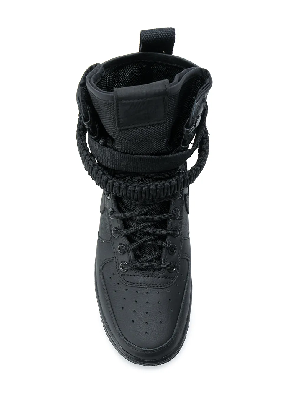 Черные кожаные кеды 'SF Air Force 1' от Nike(Найк). Петля для подтягивания сзади, закругленный носок, панели из сетки, шнуровка спереди, застежка на пряжке, плоская резиновая подошва.