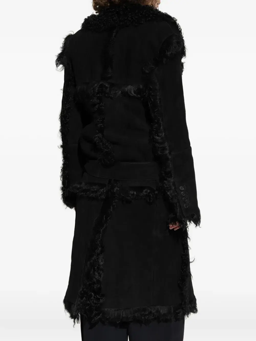 Черная замша, отделка из овчины, пояс на талии, застежка на пуговицы