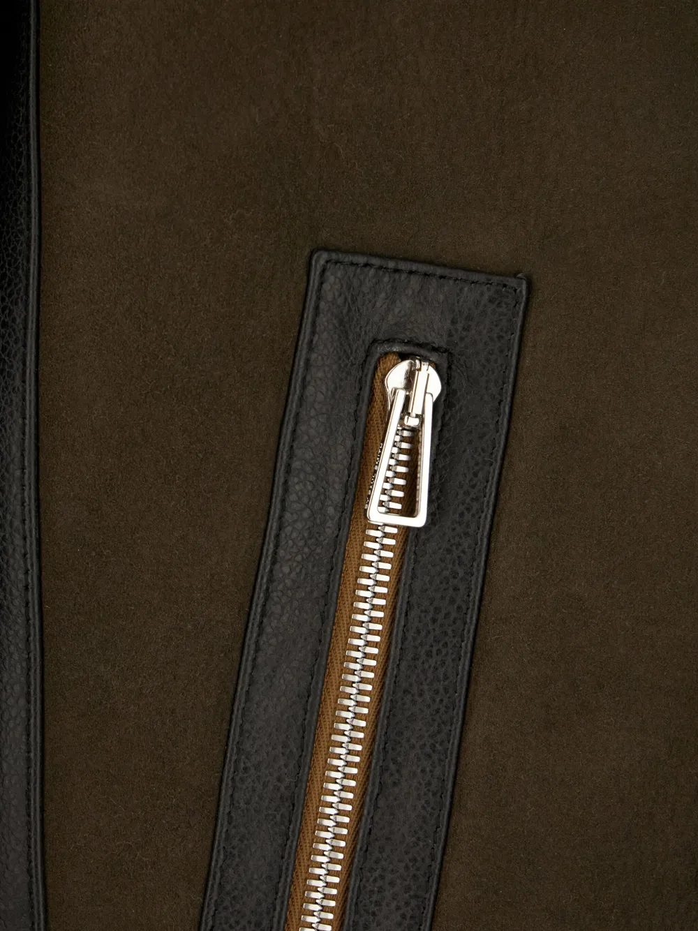 Коричневая отделка из овчины, застежка-молния, прорезные карманы, воротник-стойка.