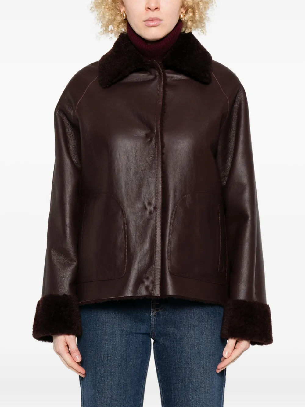 Темно-коричневая овчина с текстурой воротника, длинные рукава, прямой подол.
