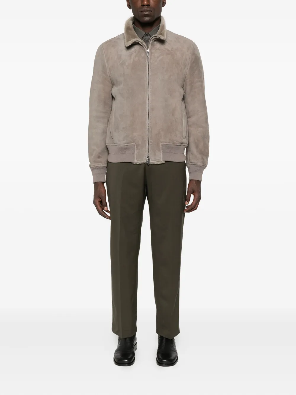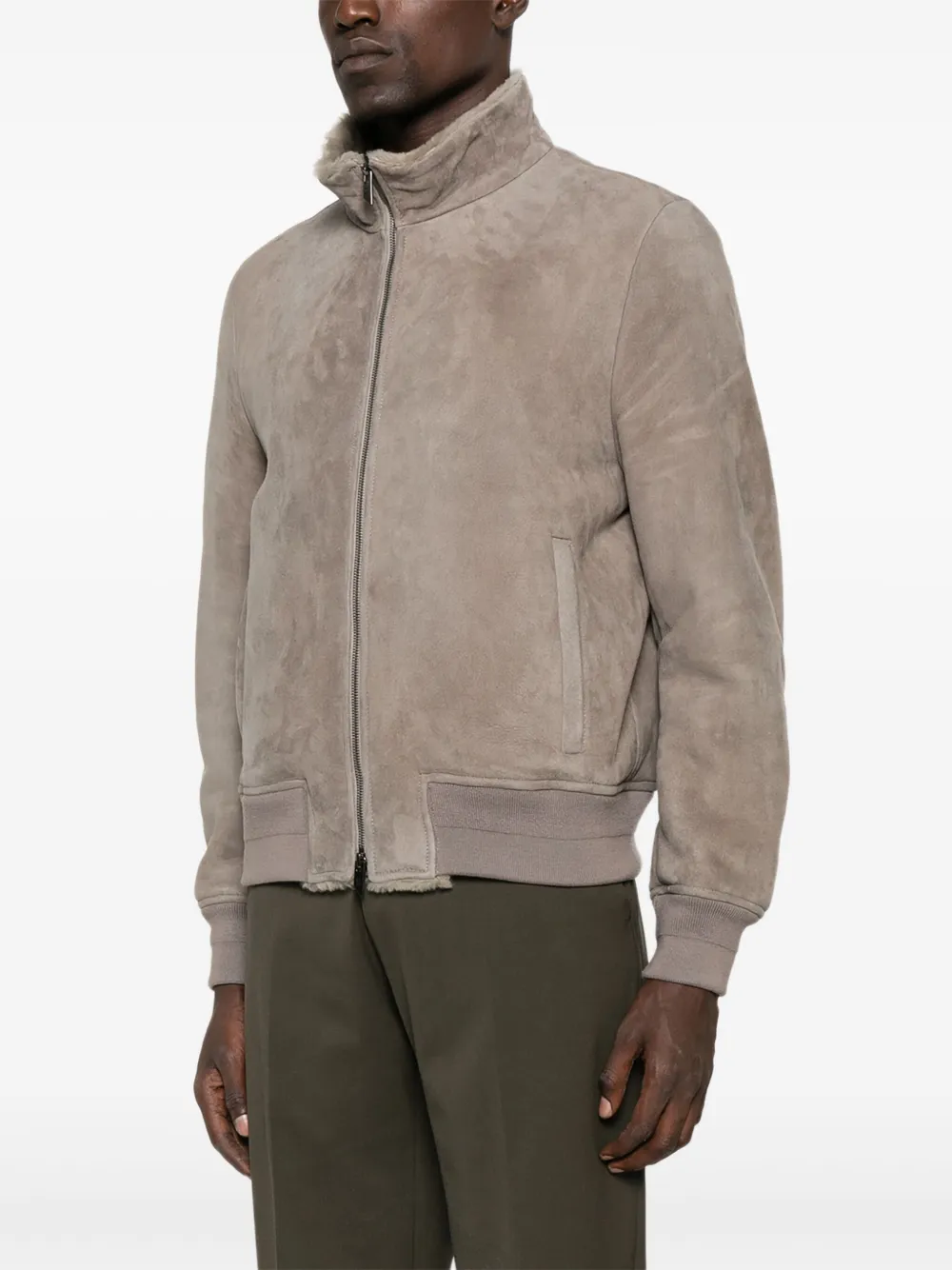 Серая овчина, застежка-молния, ребристый подол, прорезные карманы, воротник-стойка