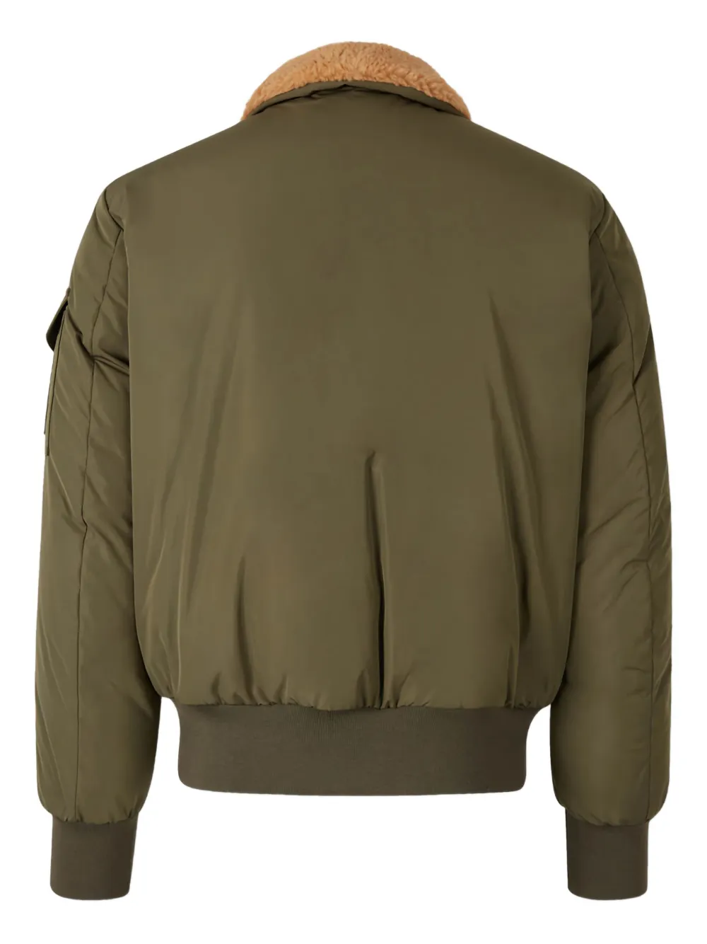 Воротник из овчины оливково-зеленого цвета, застежка-молния спереди, прорезной карман, ребристые манжеты, нашивка с логотипом.