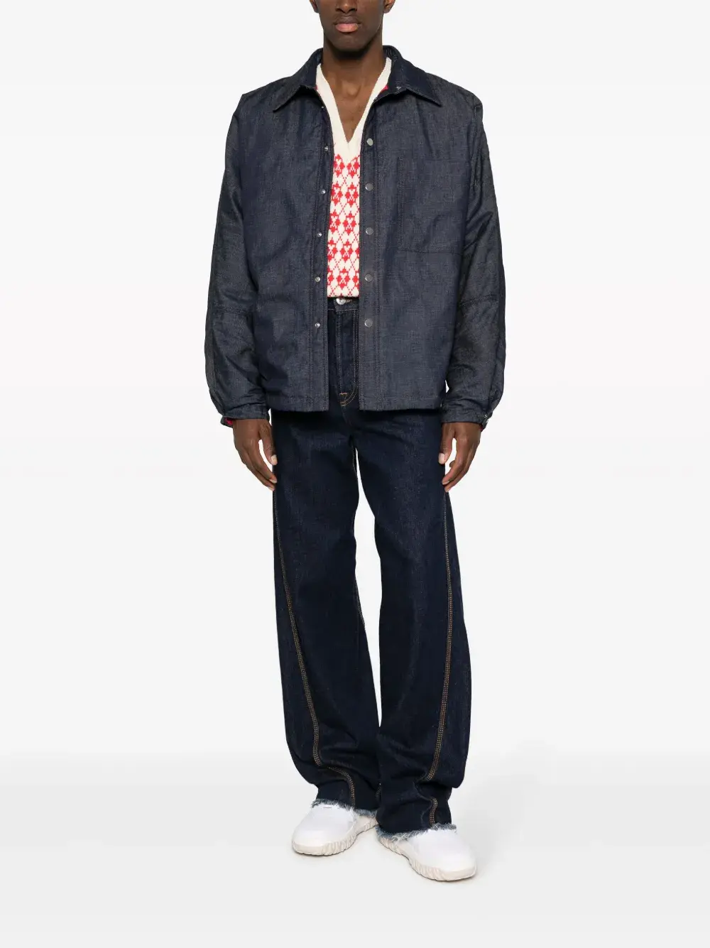 Индиго, хлопок, классический воротник, длинные рукава, бирка с логотипом, застежка на кнопках спереди, нагрудный накладной карман и прямой подол.