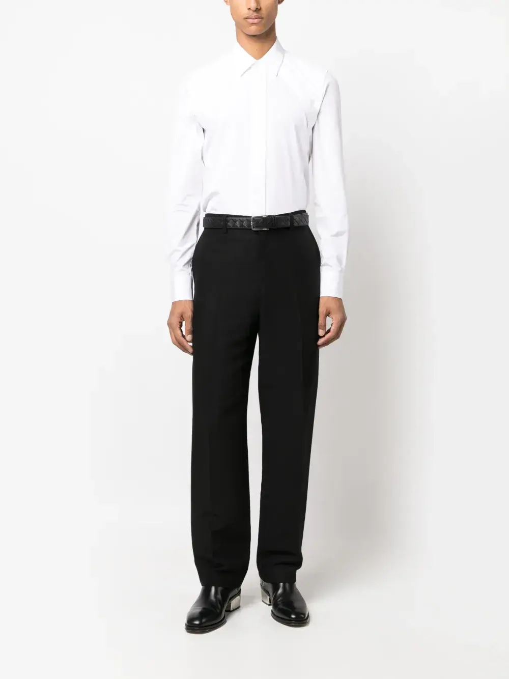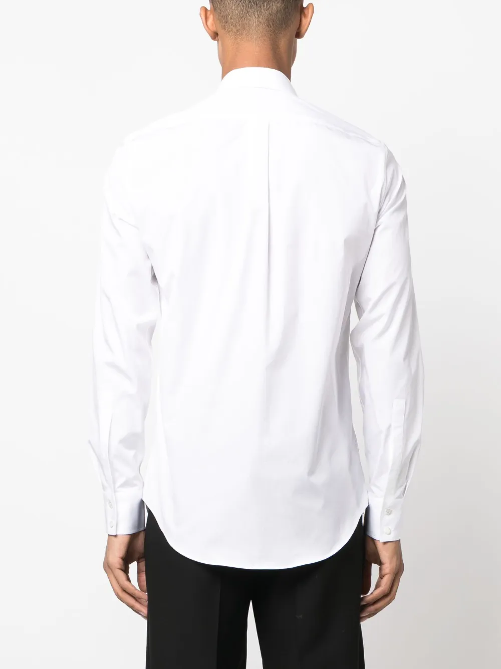 Белый, хлопок, вставки, прямой воротник, потайная пуговичная застежка спереди, длинные рукава, манжеты на пуговицах и закругленный подол.