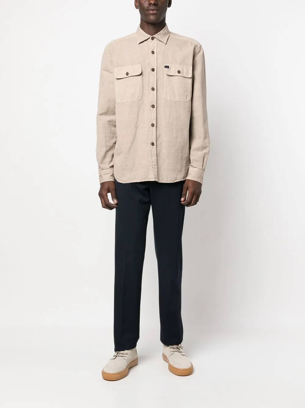 Бежевый, классический воротник, застежка на пуговицах спереди, передние карманы с клапаном, длинные рукава и закругленный подол.