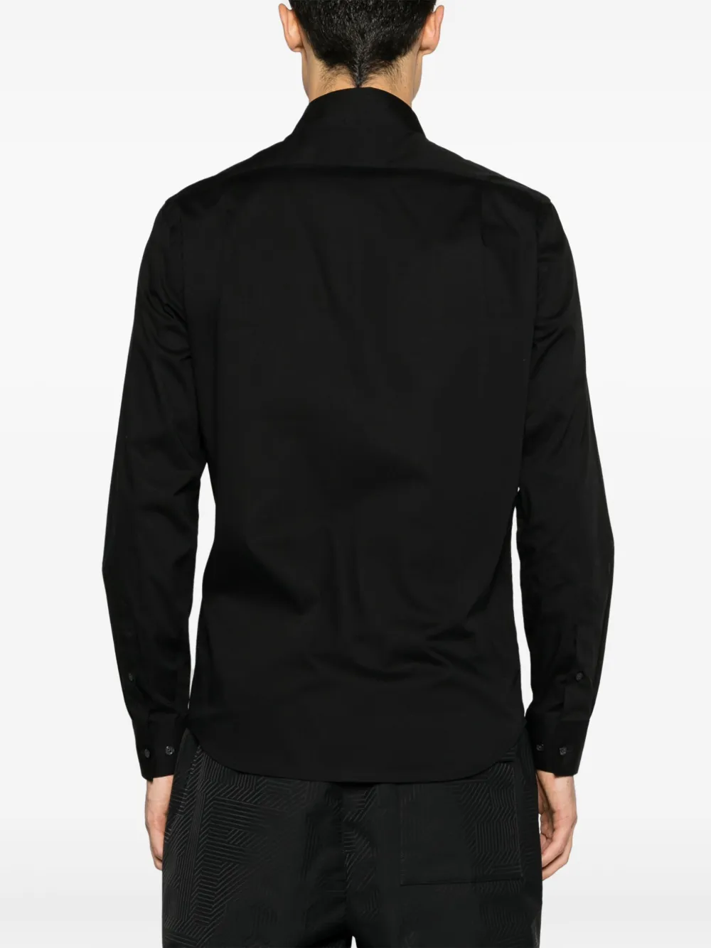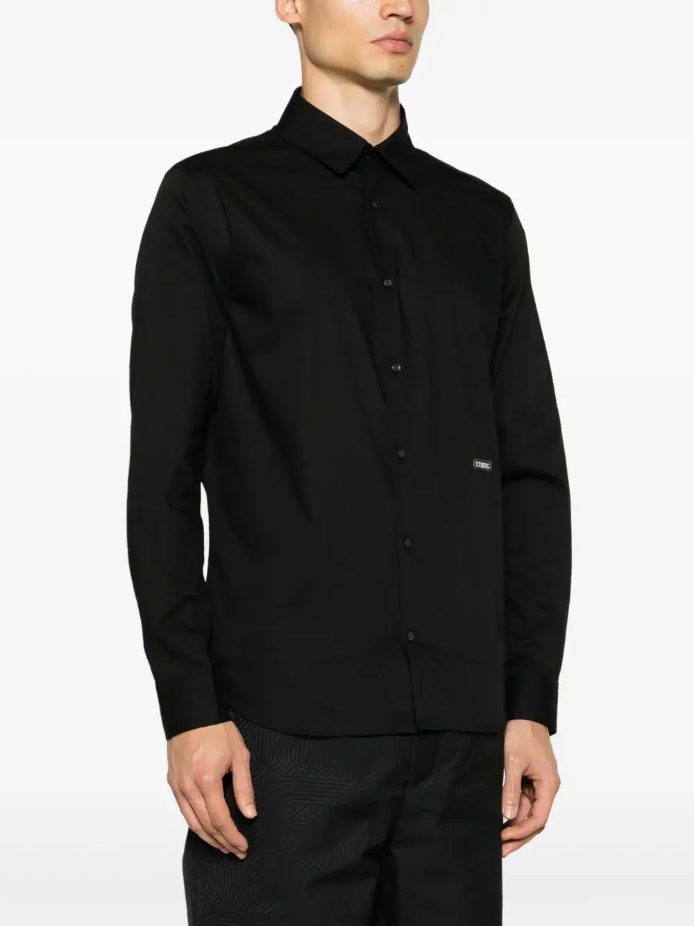 Черный, эластичный хлопок, полупрозрачный дизайн, нашивка с логотипом спереди, классический воротник, застежка на пуговицах спереди, длинные рукава, манжеты на пуговицах и закругленный подол.