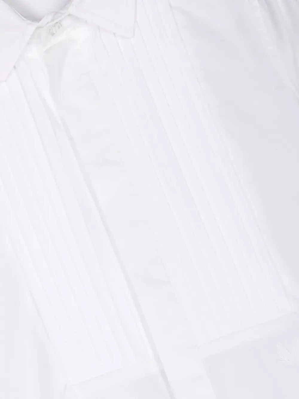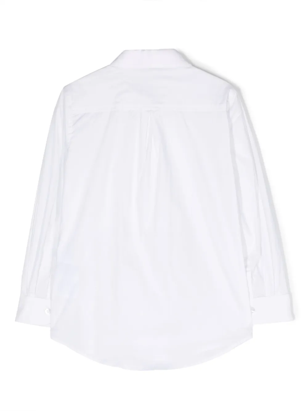 Белый, эластичный хлопок, вытачки, отложной воротник, потайная пуговичная застежка спереди, длинные рукава, манжеты на пуговицах и закругленный подол.