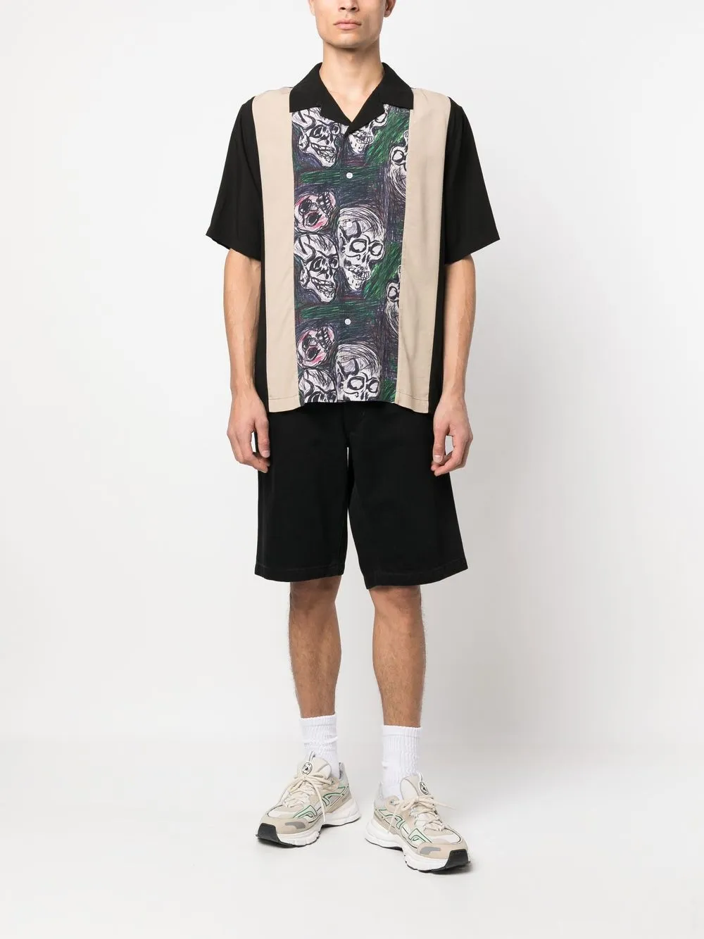 Черный/разноцветный, контрастные вставки, принт с изображением черепа, зазубренный воротник, застежка на пуговицах спереди, короткие рукава и прямой подол. Ответственный выбор: Этот товар как минимум на 50% состоит из материалов, которые признаны более безопасными для окружающей среды или сертифицированы независимыми организациями.