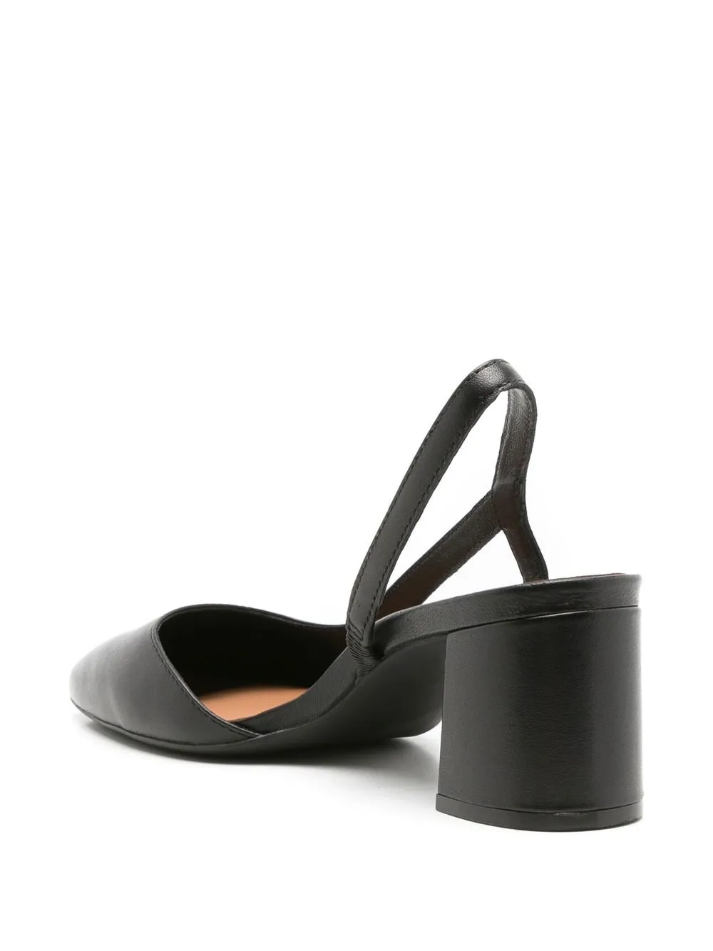Черный, телячья кожа, кожаная стелька с логотипом, квадратный носок, ремешок на пятке и блочный каблук средней высоты.