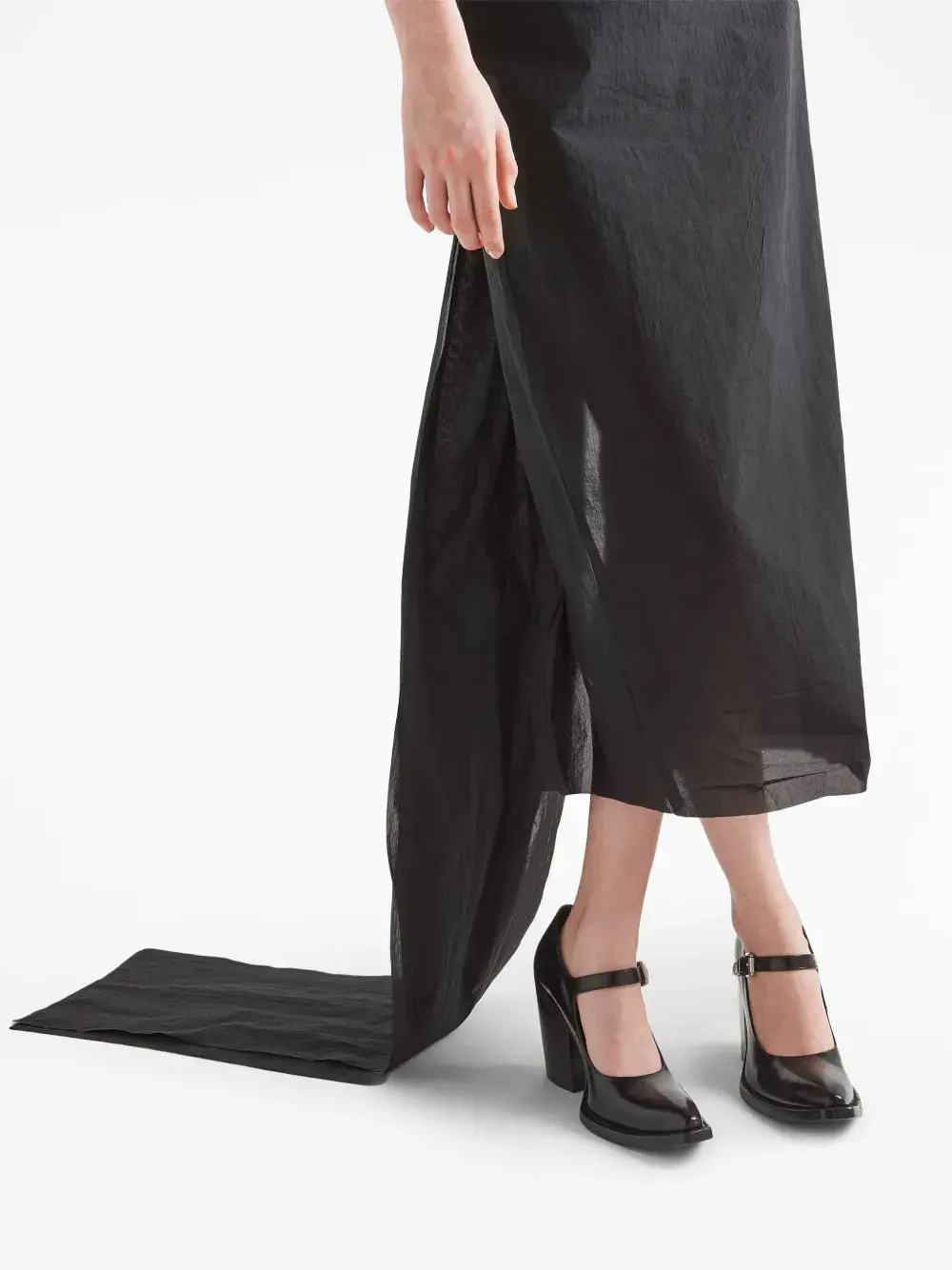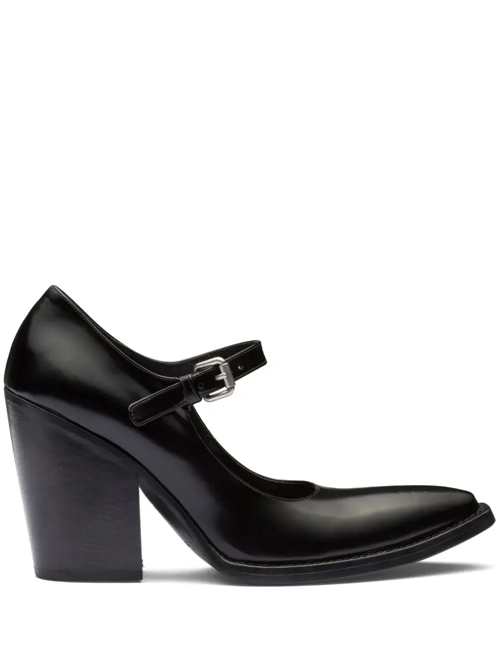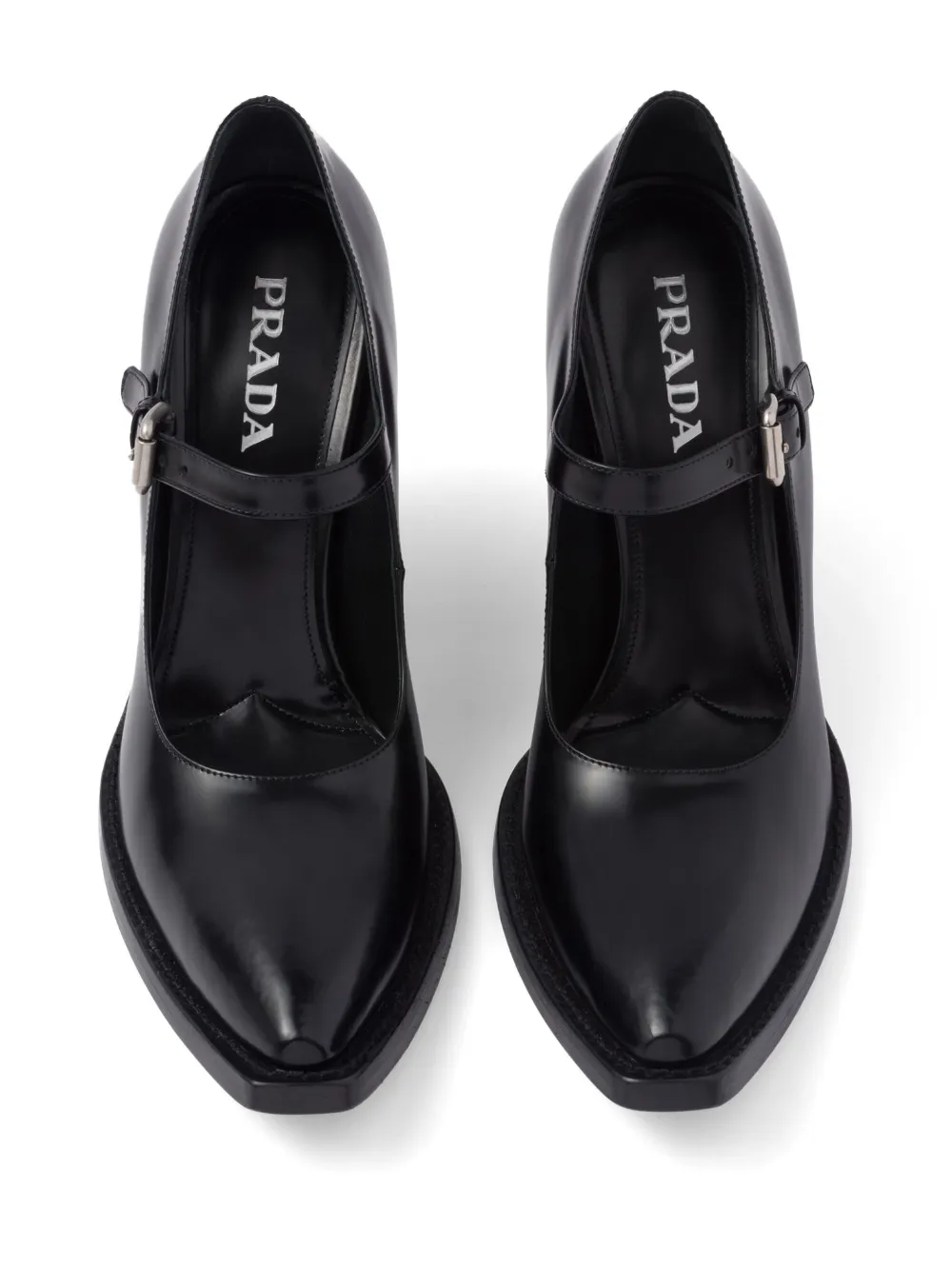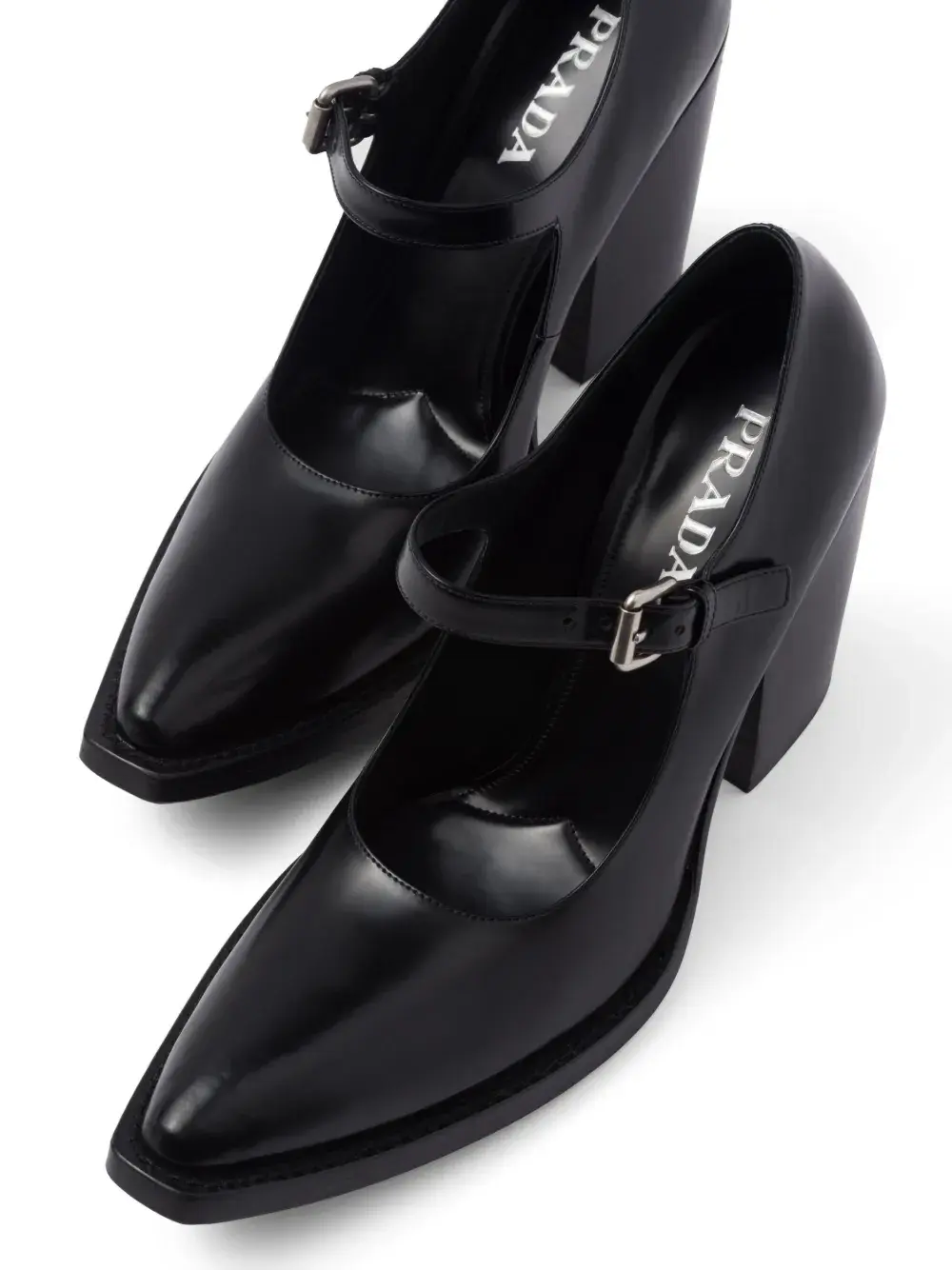 Черный, кожа, матовое покрытие, заостренный носок, ремешок на щиколотке с пряжкой, логотип на стельке, резиновая подошва и высокий блочный каблук.