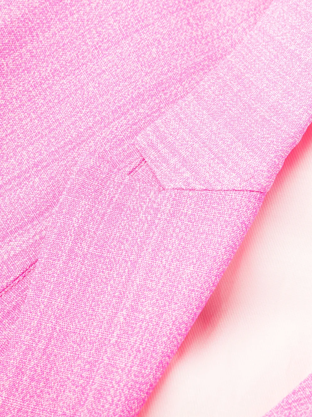 Нежно-розовый, классический крой, зазубренные лацканы, V-образный вырез, прорезной карман на груди, застежка на пуговицах спереди, длинные рукава, вырезные детали, манжеты на пуговицах, задние карманы с листочкой и длина до бедер.