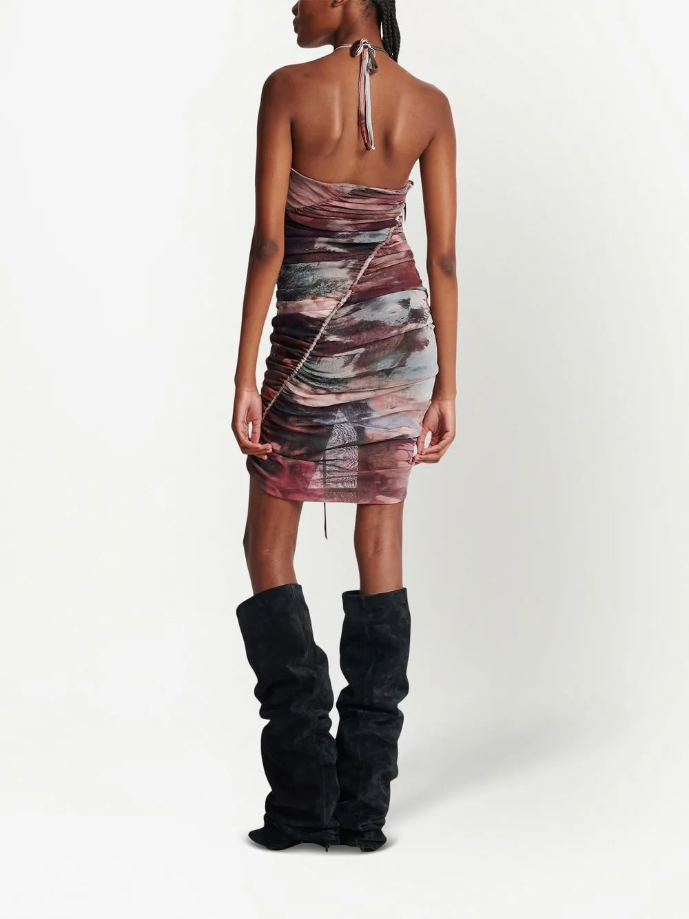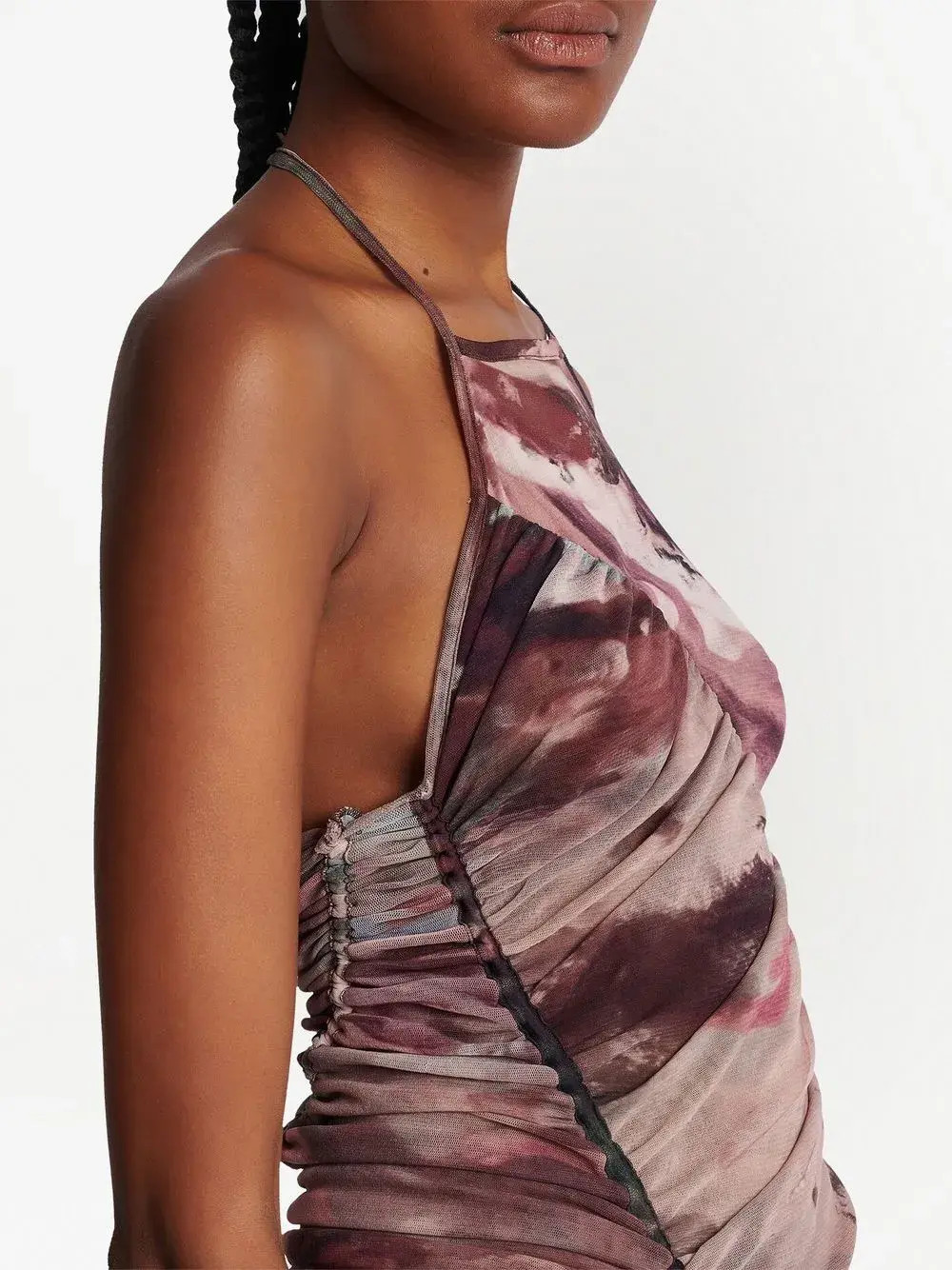 Разноцветный, абстрактный принт, детали с оборками, вырез-петля халтер, застежка на молнии сзади, длина по колено, открытая спина и отделка тюлем.