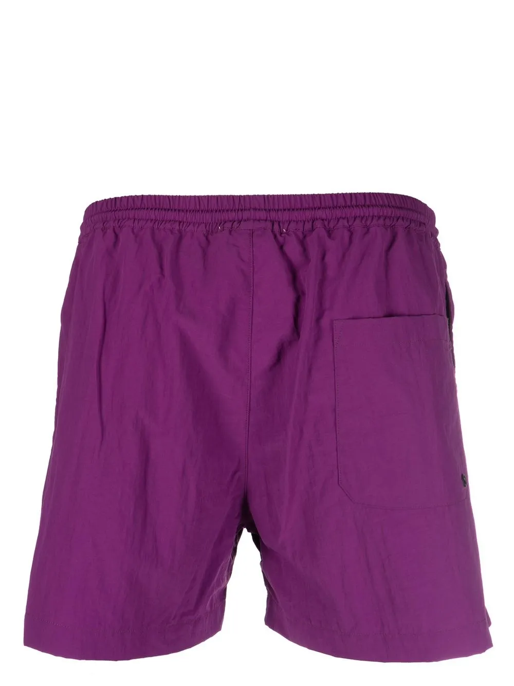 Темно-фиолетовый, логотип сбоку, кулиска на талии и накладной карман сзади.
