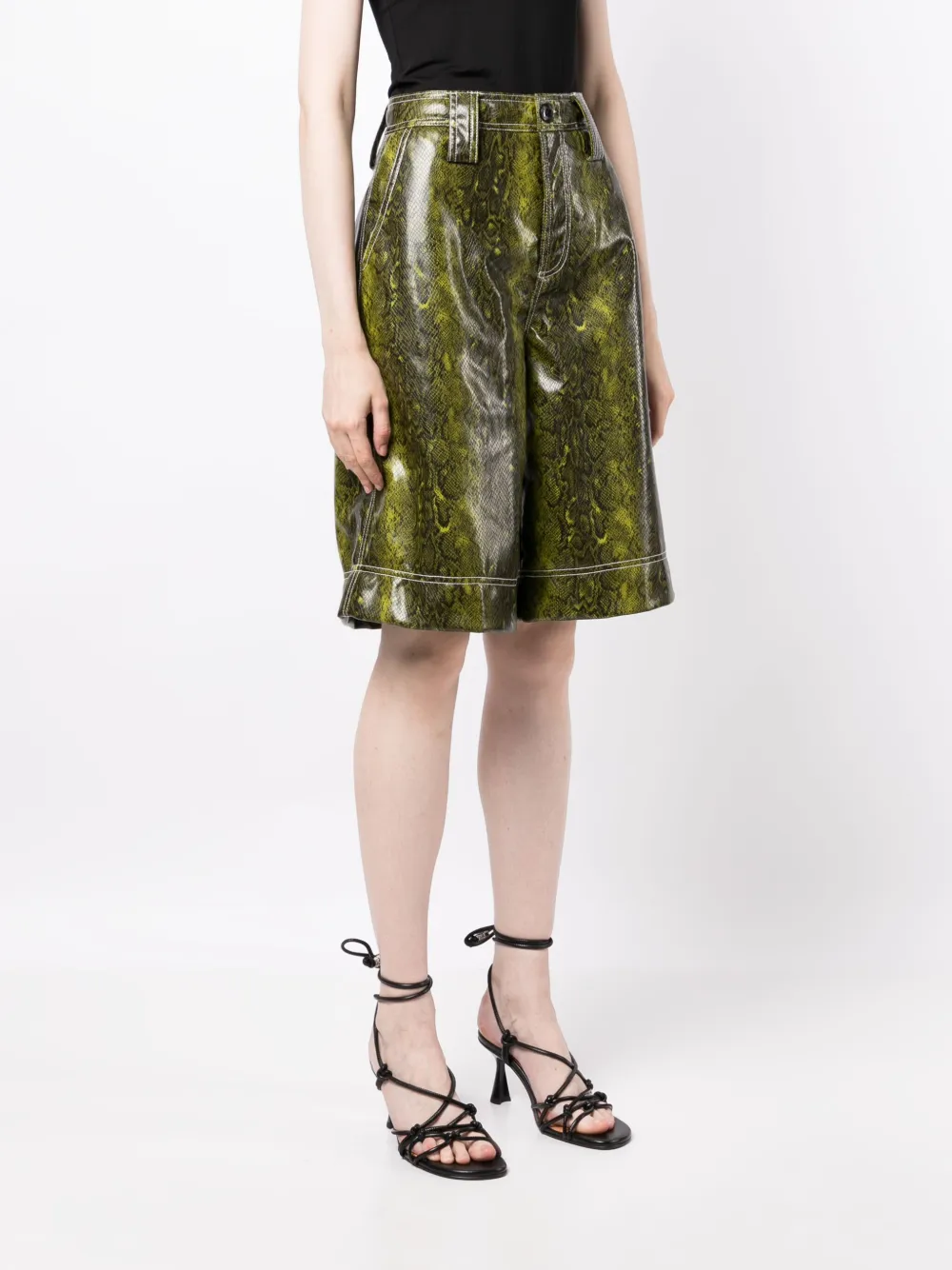 Оливково-зеленый, искусственная кожа, сплошной принт под змеиную кожу, средняя посадка, петли для ремня, потайная застежка на молнии и пуговицах, задние карманы с листочкой и длина по колено.